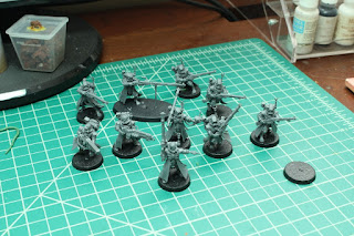 I primed these guys today. I used my old Paasche VL airbrush. I start with black primer and just add drops of white to get a zenithal effect. Pretty basic. You can see some different stages in the picture.