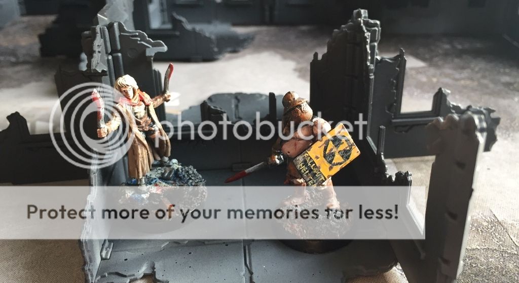 The wastelanders from New Hope Lead by "The Chosen One", a resourceful stranger equipped with power armor, a group of militia from New Hope venture out in the wastelands to secure their outposts and caravans from raider and critter attacks. The close combat experts of the outfit. Alice has shown extreme skill with the knife from a young age and prefers stalking her prey silently, waiting for a perfect opportunity to end their miserable existence with her knives. The other close combat expert is a wasteland wanderer, known as "Gladiator", he thrives in the push, shove and gore of close combat. When not joining the militia for adventure in the wastelands, he participates in blood sports in New Hope and surrounding settlements. Alice is from USX modern day heroes, while the Gladiator is made from a mix of GW bits: marauder, knight, kroot, and greenstuff. The other four members of this militia band are: Slick, a low-life gangster renting out himself and his sawn-off as an escort in the wastelands. He is a reaper bones figure. Frank, a veteran caravanner with a scoped rifle. He is a zombicide survivor miniature. Vault Wendy wandered into New Hope one day, wearing a vault suit with "113" on the back and strapped with weapons. As a pretty blonde, she had to gain respect the hard way, by killing the first two sleazebags who tried something stupid. Now she is a valued member of the city militia, even if she will not tell where or what this Vault 113 is. Miniature is from USX modern day heroes. Kane "The Champ" Savage is a militia lieutenant. A veteran caravanner and blood sport enthusiast, he can handle himself in both melee and a firefight. He is the current champion of the cage in New Hope, and wears the champion belt at all times. Miniature is a mix of GW bits: Marauder, IG command and a third party assault rifle. This group is a 400pts Caravanner warband from "This is not a test" Caravanner Warband "The Companions": Trade Master "Chosen One", power armor, heavy weapon Caravanner Lieutenant "Kane the Champ Savage", assault rifle, heavy weapon Caravan Guard "Frank", sniper rifle, light weapon Caravanner "Alice", 2x light weapon Caravanner "Vault Wendy", 2x pistol, light weapon Caravanner "Slick", shotgun Brute "Gladiator", light weapon, heavymetal armor, primitive shield