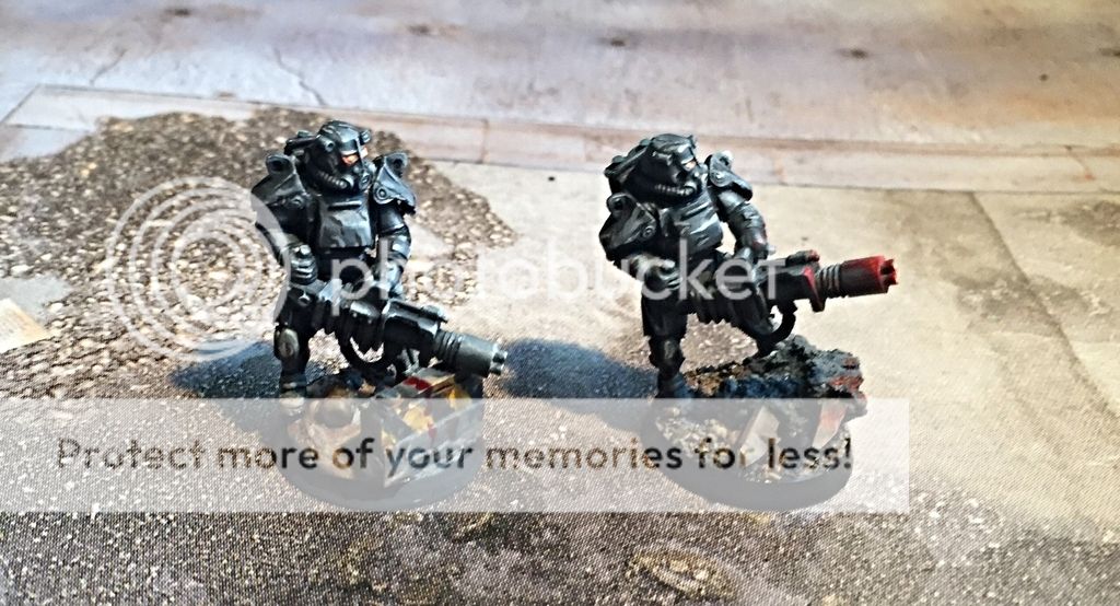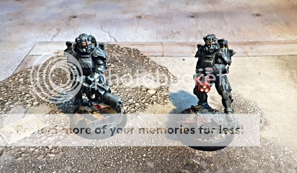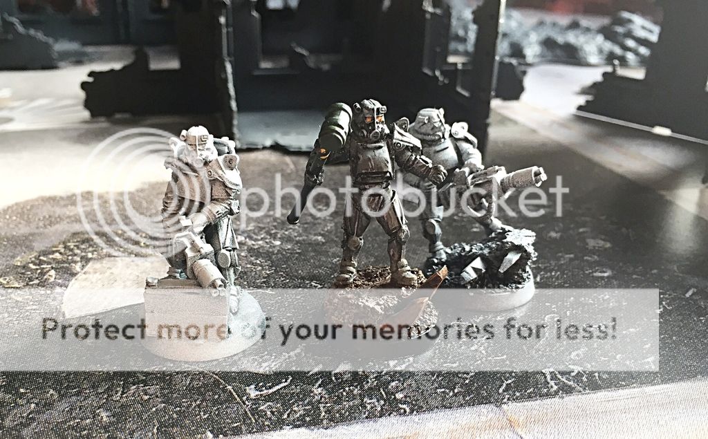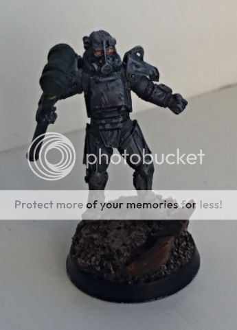 The BoS guy is my attempt at NMM, google it to find better guides than I can give you  In short, I sprayed him black, then white from above to get an idea of light and shadows. Then he got many thin layers of progressively lighter gray. The areas with most "light" got the lightest colors. Then I scratched his armor up to show that it has been used. He will get some more friends soon, so he doesn`t have to hang with loser wastelanders anymore