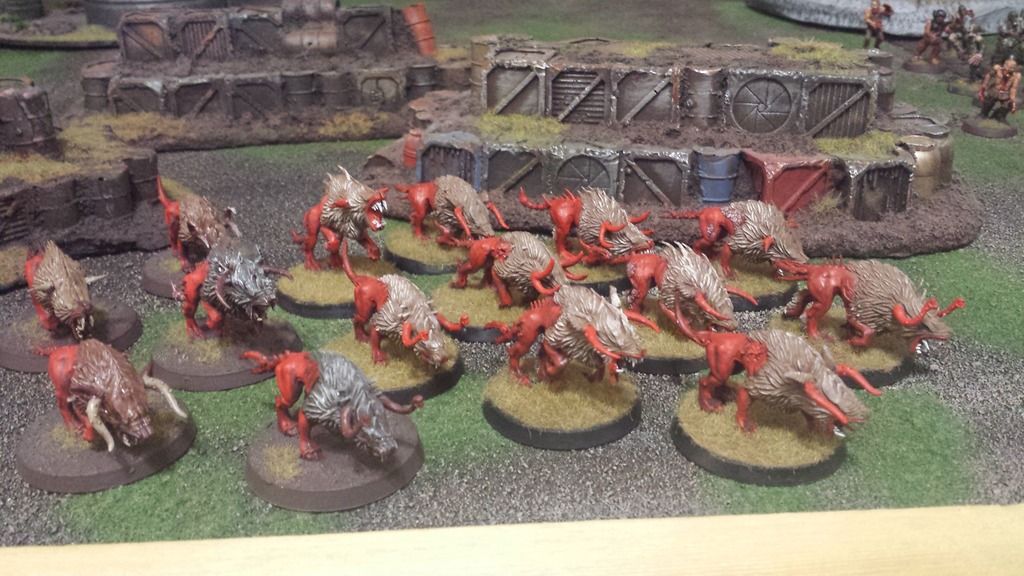Ever since I completed my first zombies it's been a game of counters. The Daemonkin didn't like all the undead running amok on the board so a large unit of 15 flesh hounds was made to test the theory - what happens when you hit zombies with a blender.