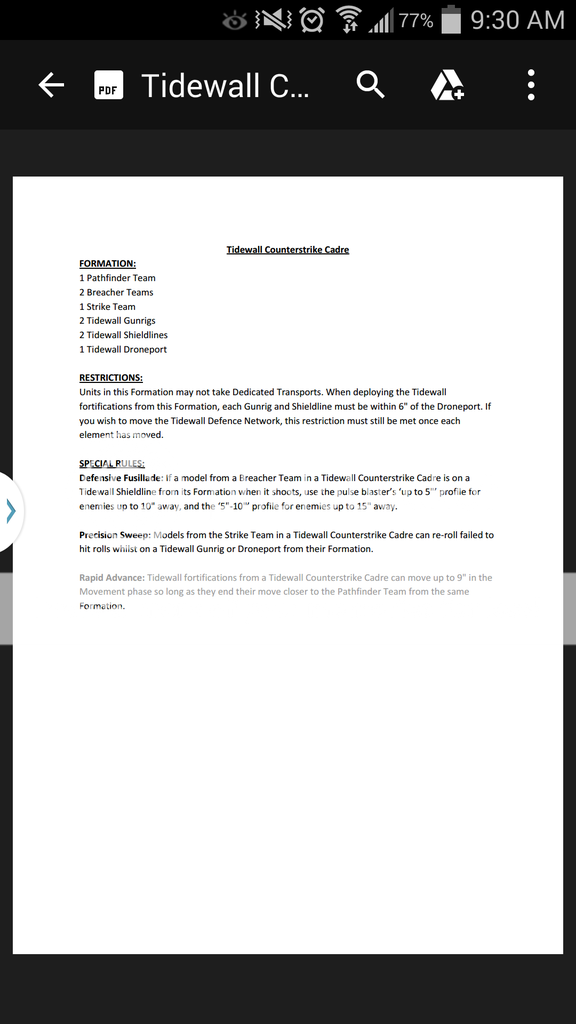 So if that PDF is correct it's not even nearly as good as the skyhammer. Being able to move an extra 3" with breacher guns reaching 10" isn't that great considering you never want to moving closer to anything that could beat you in assualt, which as tau is everything else in 40k. Twin linked fire warrirors? I mean it sounds good but not effective enough to warrant taking a massive amount of points worth of firewarriors and breachers. At the end of the day they are still all t3 models with 4+ armor. Not terribly suriviable. I guess there getting nice cover saves from the fortification but still. If something closes in on you you're dead.