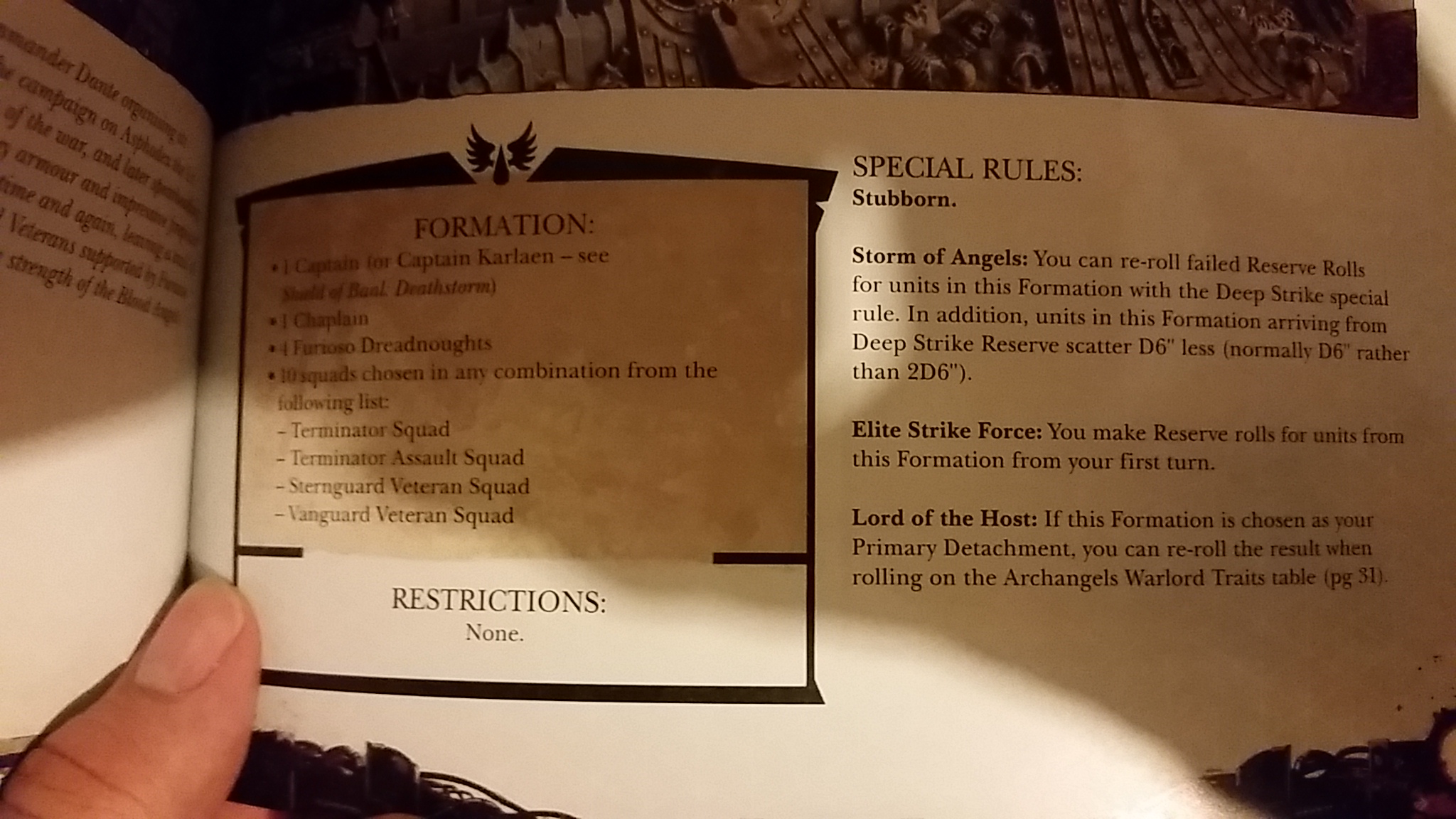 I'm at work so I only have battlescribe to go with - but it looks like it is only "The Archangels Strike Force" with the terminator armor requirement (which is what I remember from reading the book last night as well). This list uses the formation "The Archangels" I know its pretty close but not the same - this one is the 4 furioso/10 vet squads one (could be sternguard or terminators also).