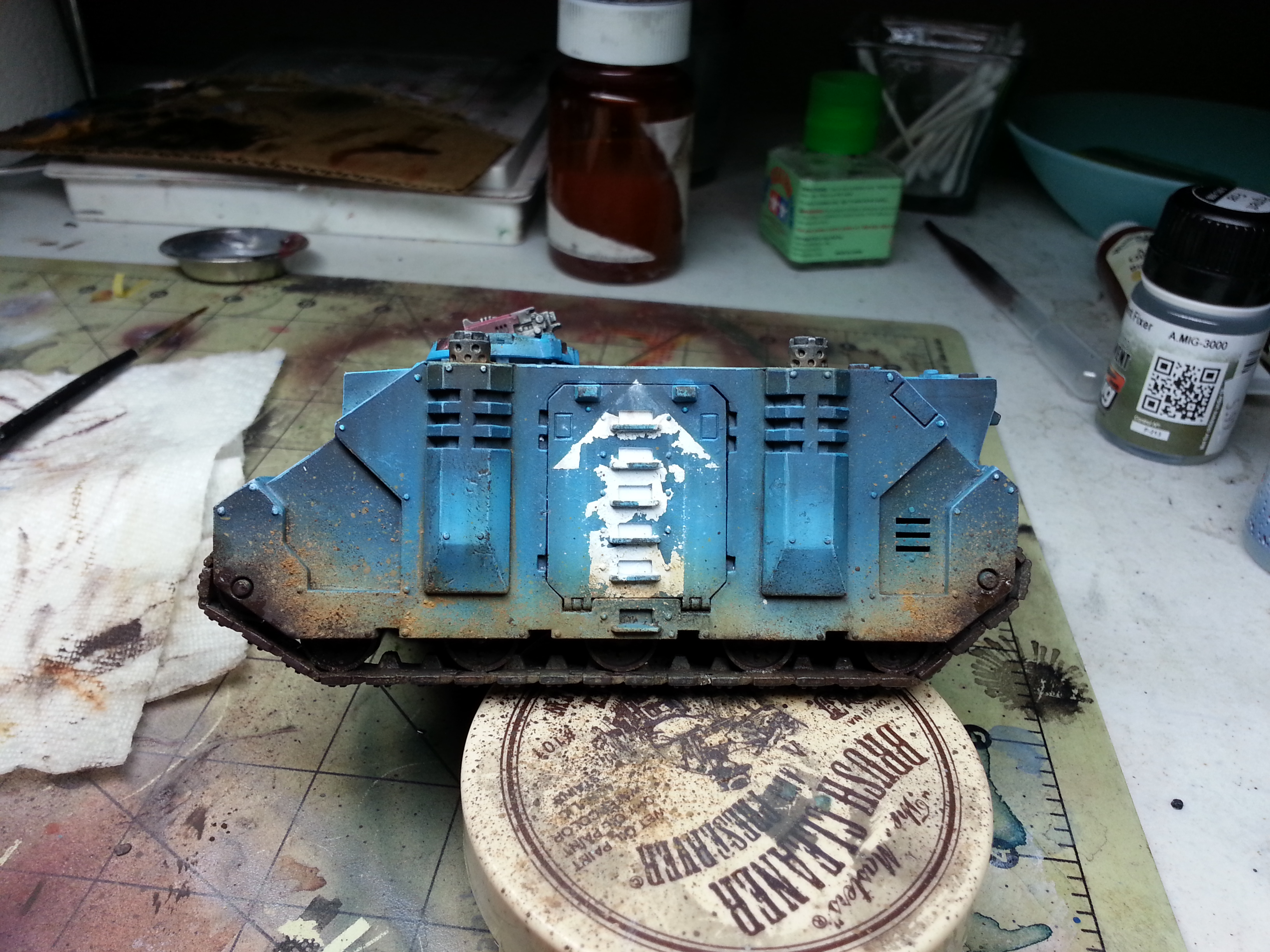 Mixed media is a fancy word I learned the other day, it means using more than one type of paint medium for a project. In this case it was acrylic paint, oil paint, enamel paint, and dry pigment. I used a lot of different techniques: