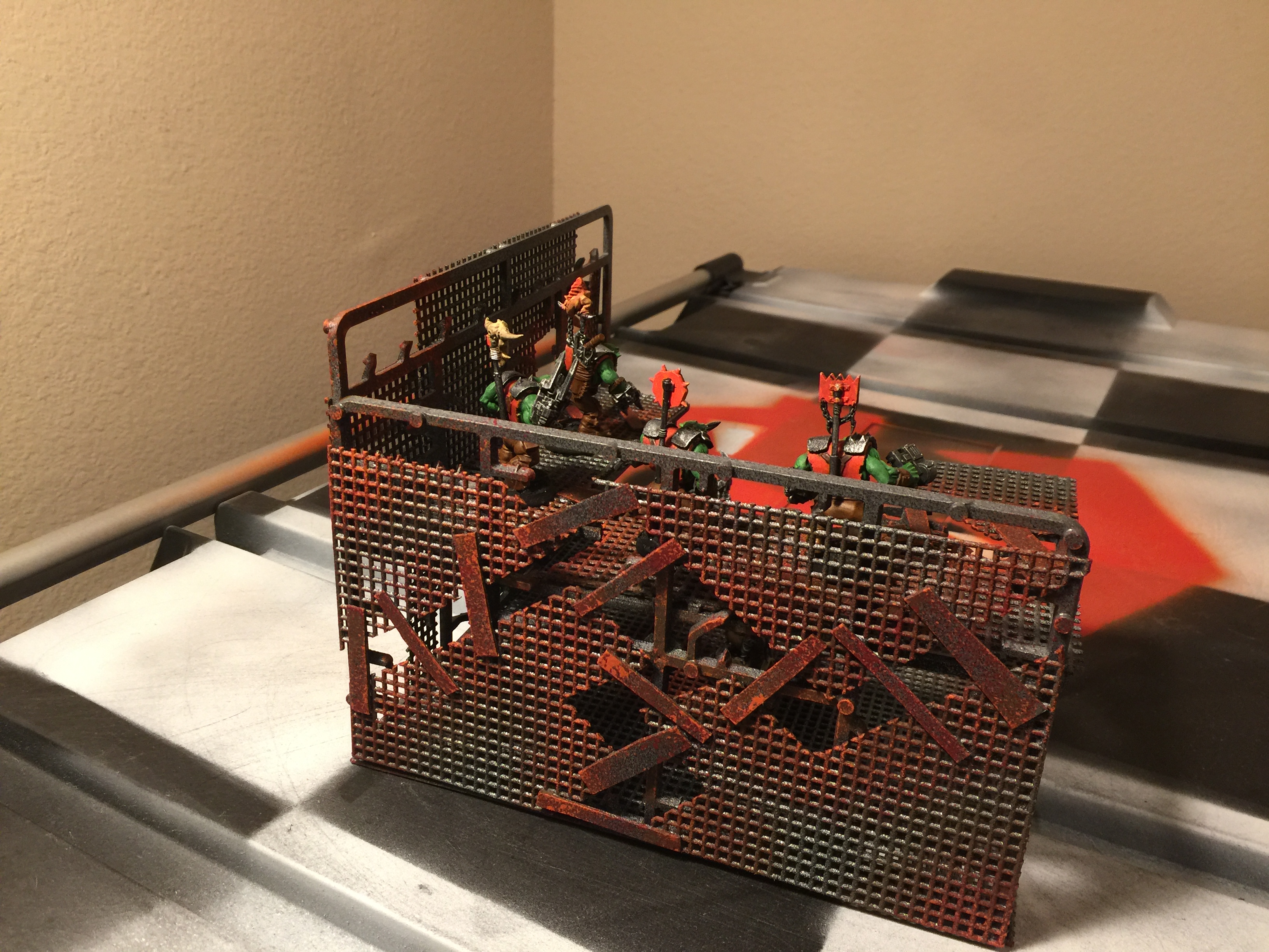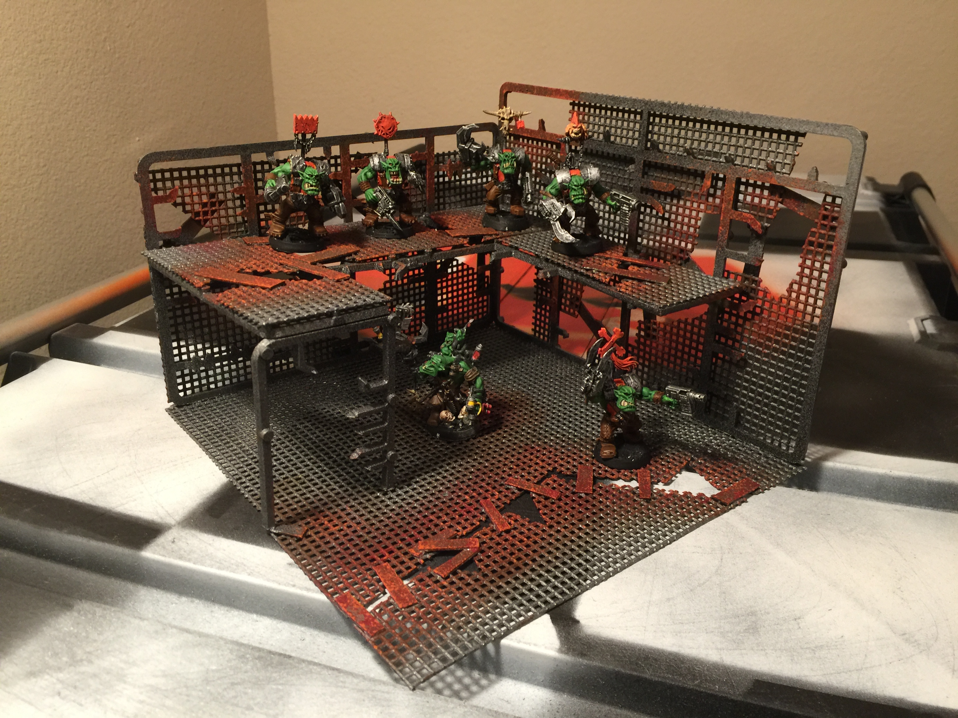 Nice use of sprue. If I could offer a suggestion: add some more plasticard to the floor to break up the perforated plastic. More randomness will make it good and Orky.