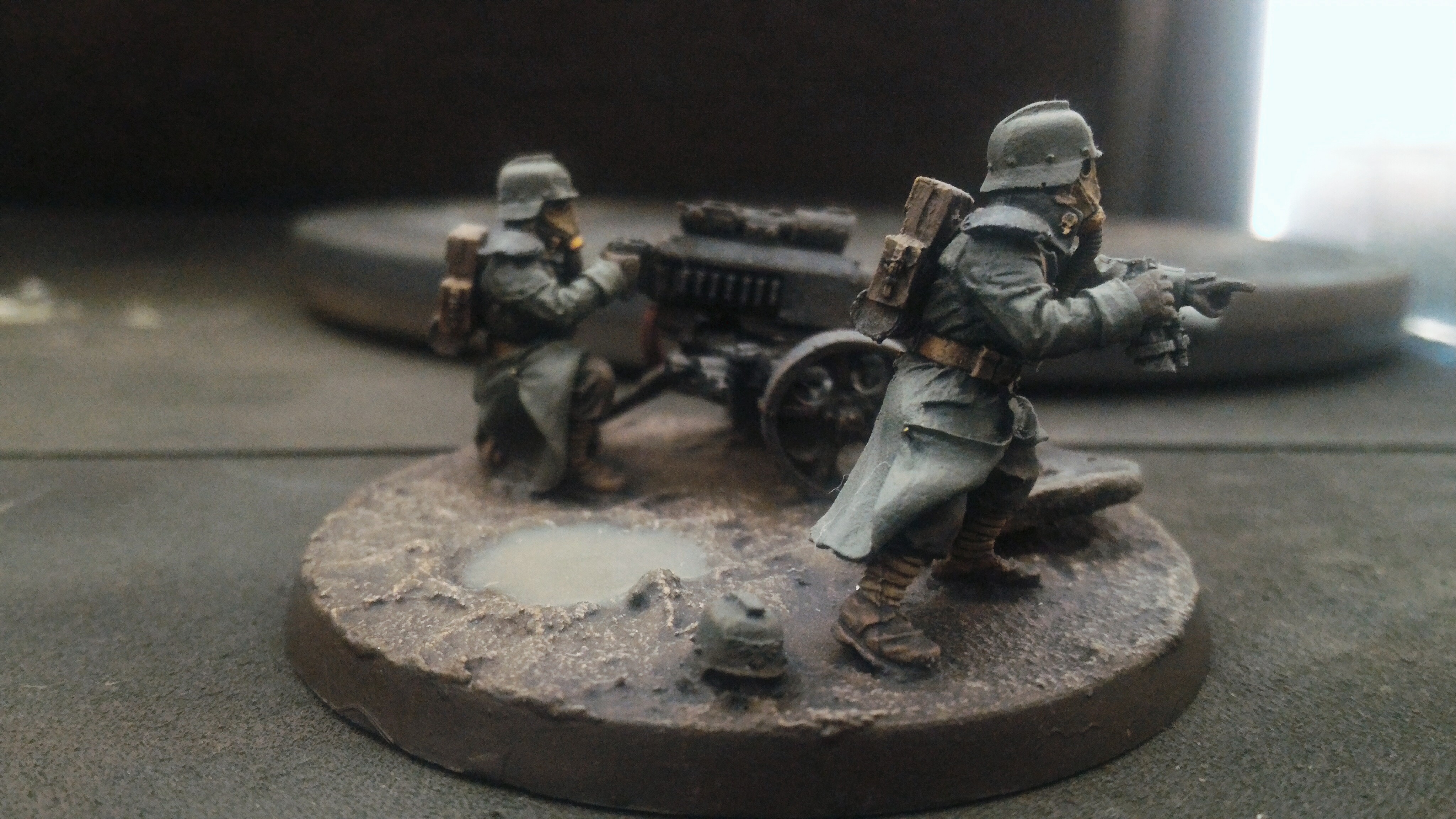 I don't think they need dramatic mud or anything, but a little subtle dirt and dust on the boots and lower edges of the coats would add some realism. When they're kneeling on the ground like your gunner is their uniforms would pick up a little dirt, and DKoK aren't going to be able to spend 23 hours a day polishing their armor like space marines. A very light drybrush of the main color of the dirt on your bases would probably be enough. You aren't trying to have them caked in layers of thick mud, you just want to tint the color of their uniforms a bit.