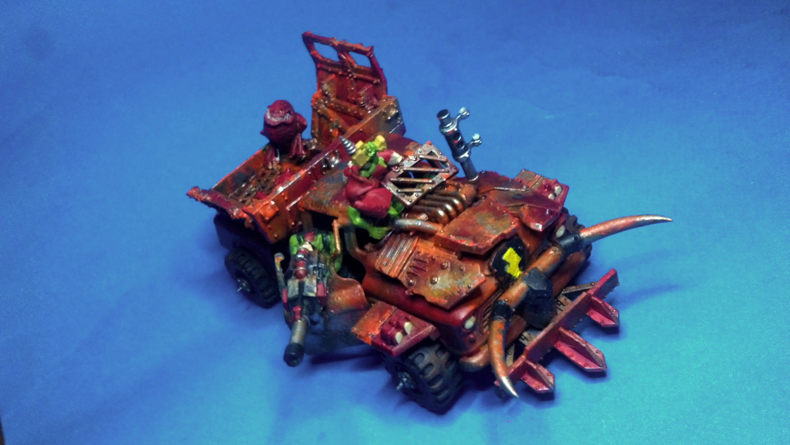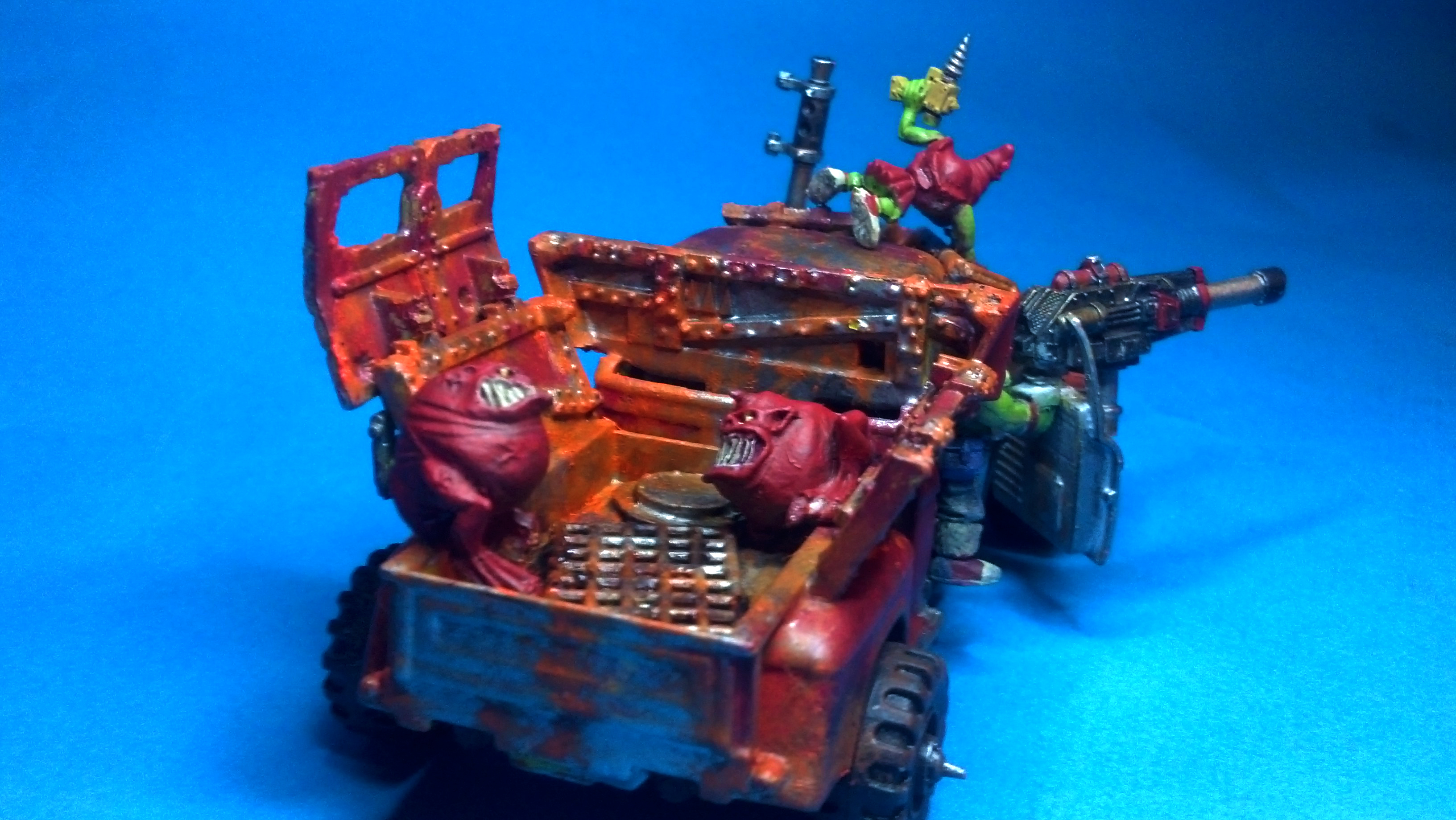 Using the base of a diecast F-1 Pick-Up, plastic bitz from the new trukk, old trukk, mek gun, black orcs and night goblins + metal bitz from the RT Dreadnought and Cave Squigs.