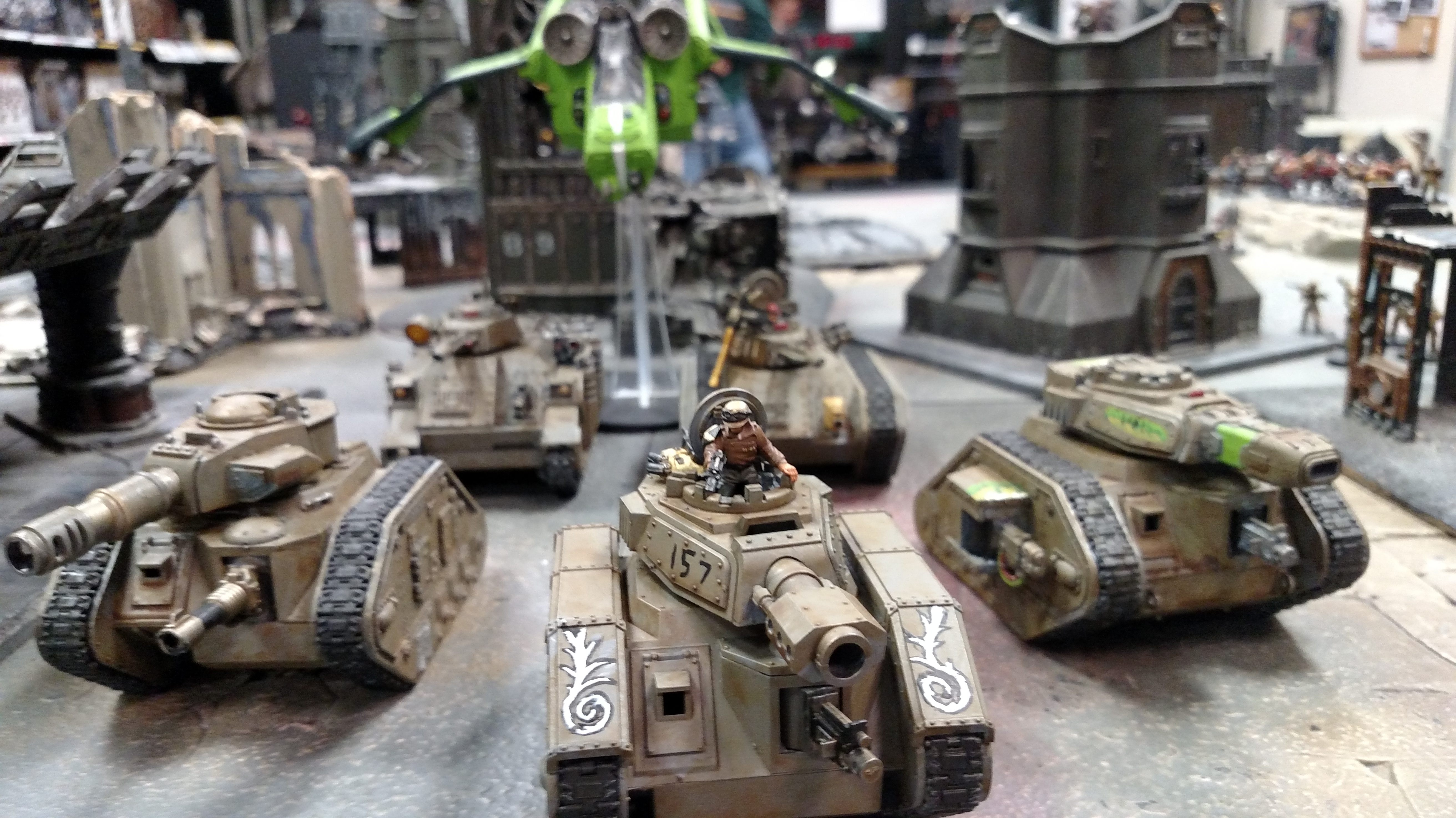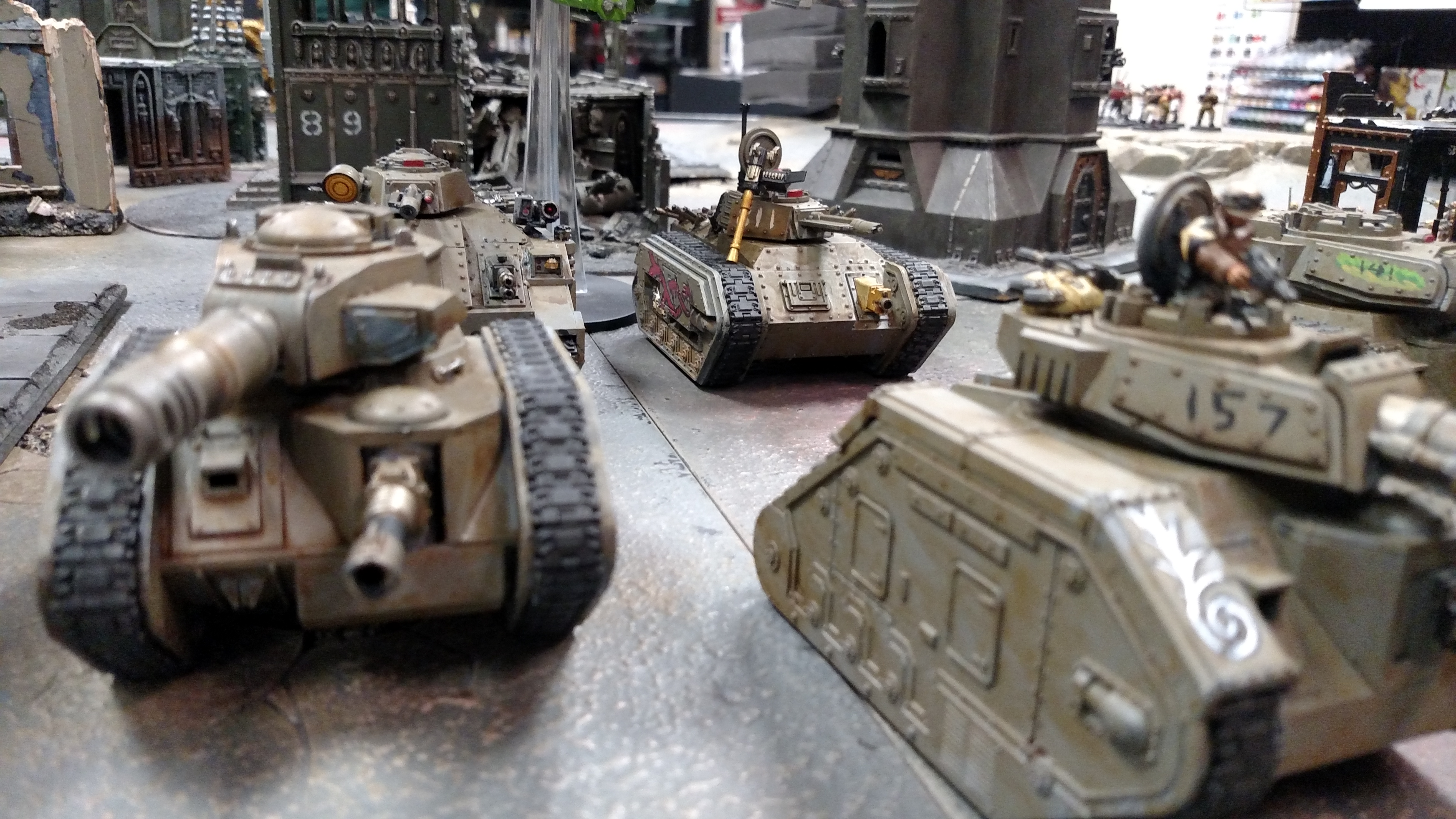 Pictures 4 and 5 show off some of my favorite vehicles I've created, although not very well, I'll need to use a better camera or maybe not have them around so much terrain. The three lemon russ's are Gertie (left) Clyde (center) and Bonnie (right) Gertie was an old model russ I saved from a friend's bitz box. Bonnie and Clyde usually stick together