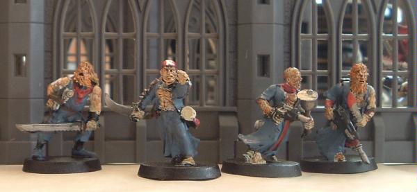 Four heads were chopped off of a set of FW Chaos Militia Enforcers and added to these figs while the four Enforcer bodies got other heads.