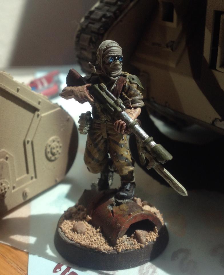 Greetings Dakka, its been a while. Here I have to share the first of my custom Tallarn infantry for my Armored Battle Group. They will be used as tank hunter vets. Body is Victoria Miniatures and the head is from MaxMini. The cast on the arms left a pretty brutal mold line unfortunately. I did what I could given the severity of it. More to come once I build my way out of this mountain of wood elves!