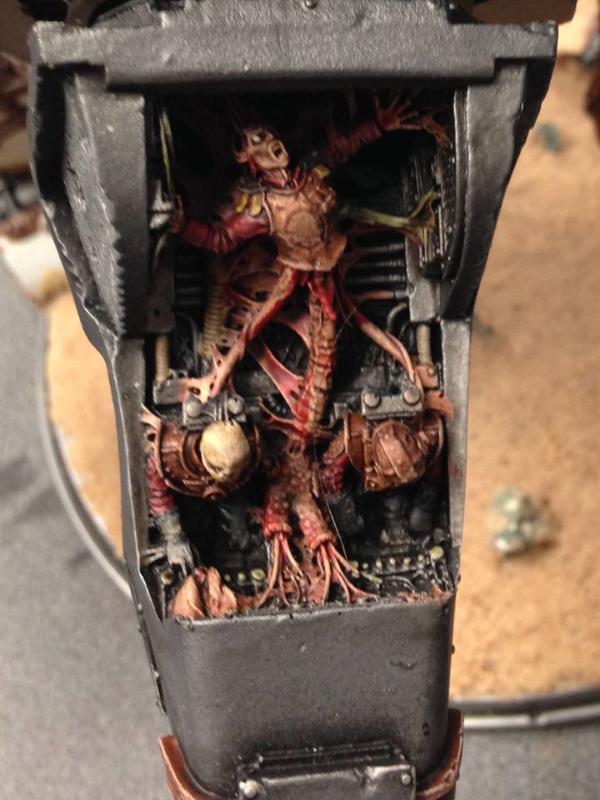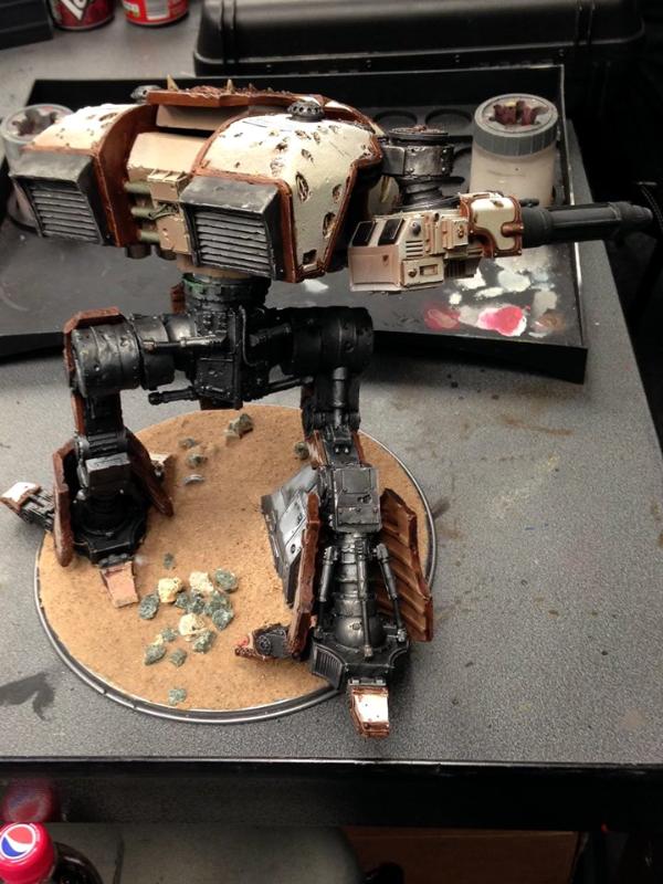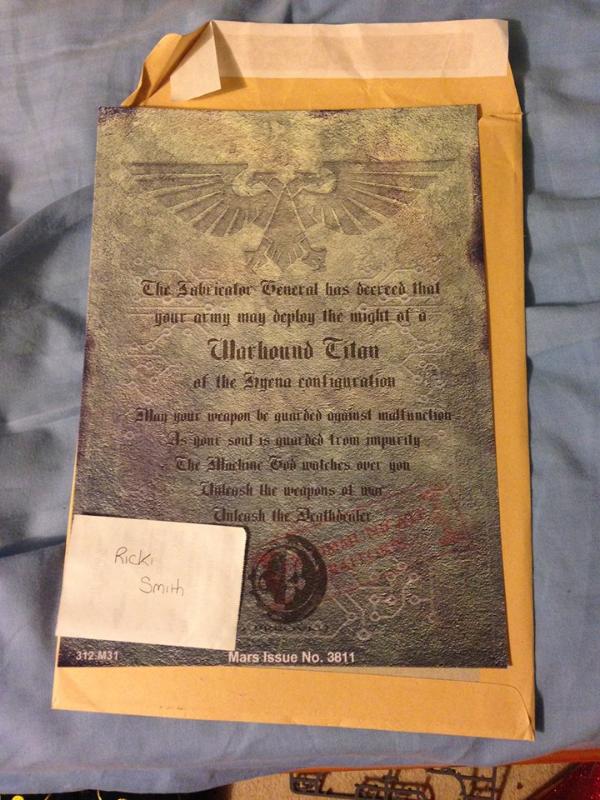 One well painted Warhound Titan (Chaos) with plasma blast gun and double barrelled turbo laser destroyer modelled on round metal base. Due to posing the Valkyrie wing supports the right shin, the model is detachable at the waist and the crew compartments open out to show the interior.