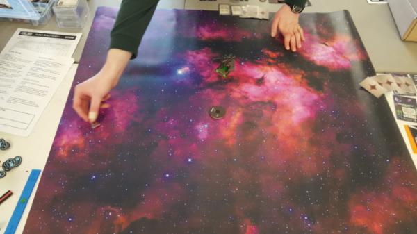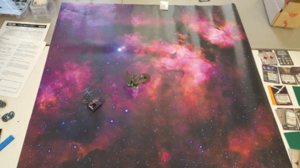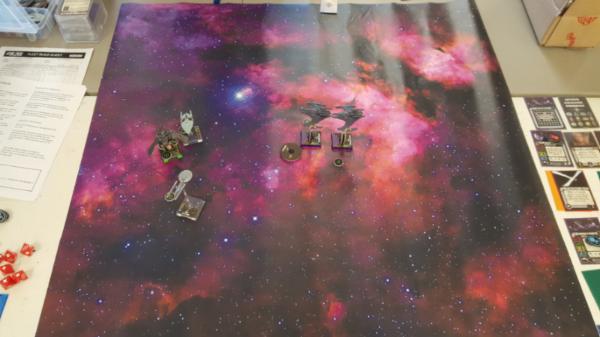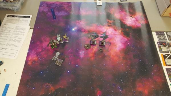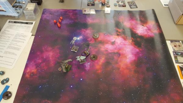 I'm facing the Enterrpise refit with a bunch of crew, a stock Ent-E (the generic one), and he managed to pull the IKS Toh-Kat. He was one of the weaker players in the club house, but he managed to win his first game, so luck of the draw I faced him. It wasn't much of a game- After a couple turns, I realized I could out last his fleet simply by letting the Sphere and scenario do damage to him, and it readily complied. The game ended when Matt Decker blew up the Sphere on Turn 8, and the Omega used the Organic Conduits to come about in a surprise maneuver and throw 8 attack dice at the Enterprise Refit. I didn't lose a single ship.