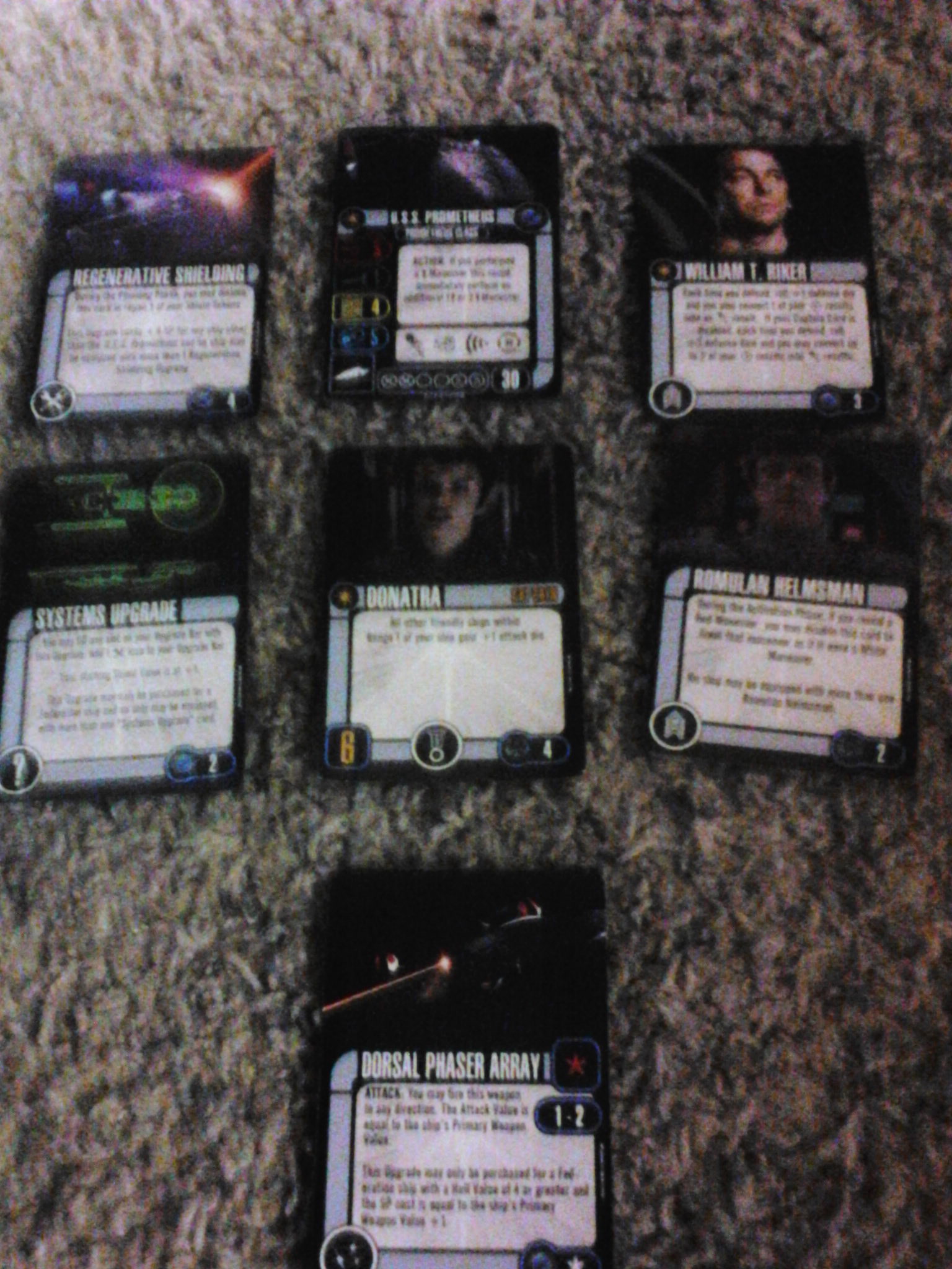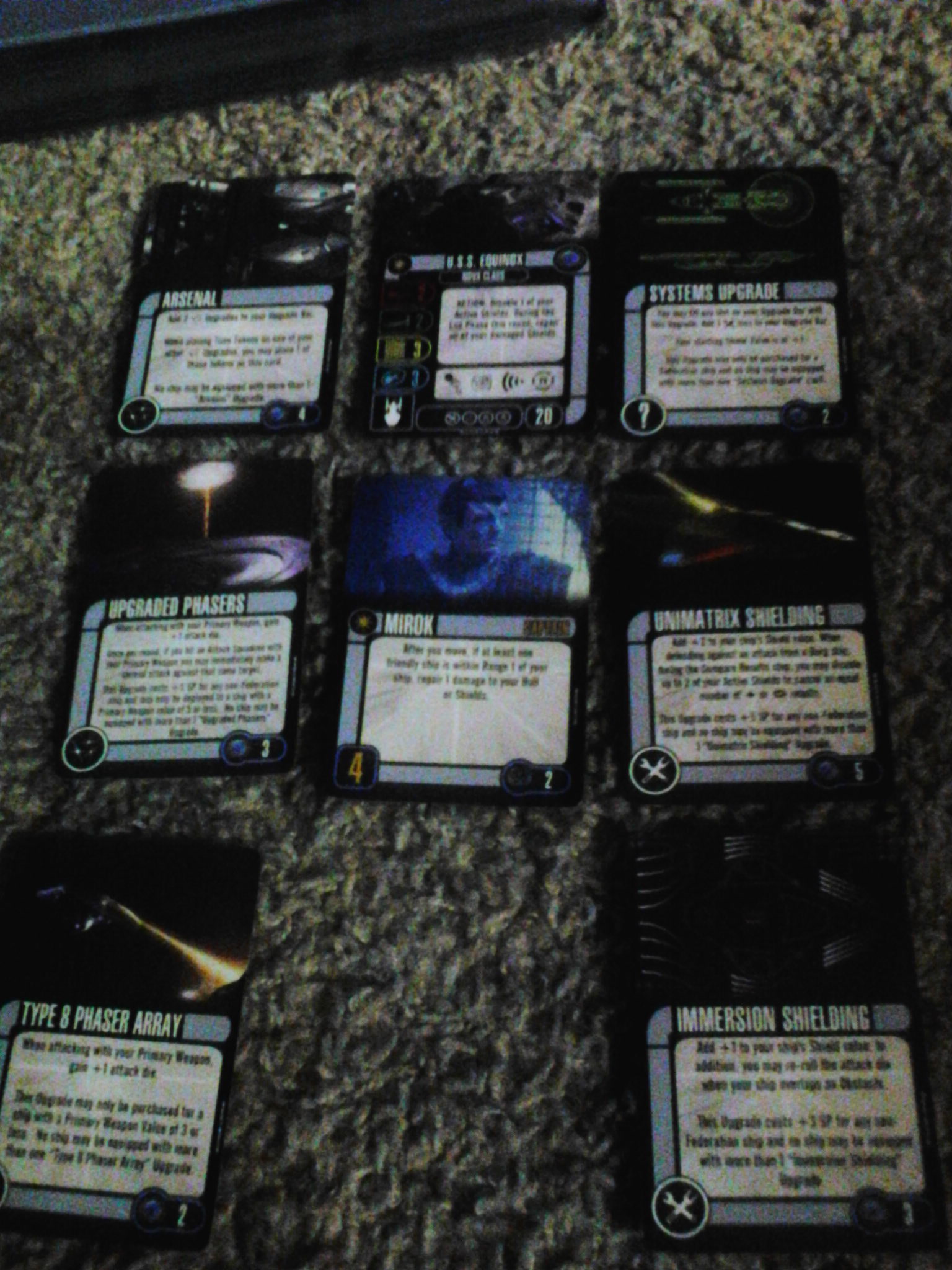 The second and third went significantly better, with my Bajoran being the only ship to fall, and the sphere dying horribly each time. The Action on Phaser Strike (attack at captain skill 10) is amazing. I let my opponent do all the heavy lifting, then firing my Bajoran off to finish the sphere, them picked apart the rest of their fleets with relative ease.