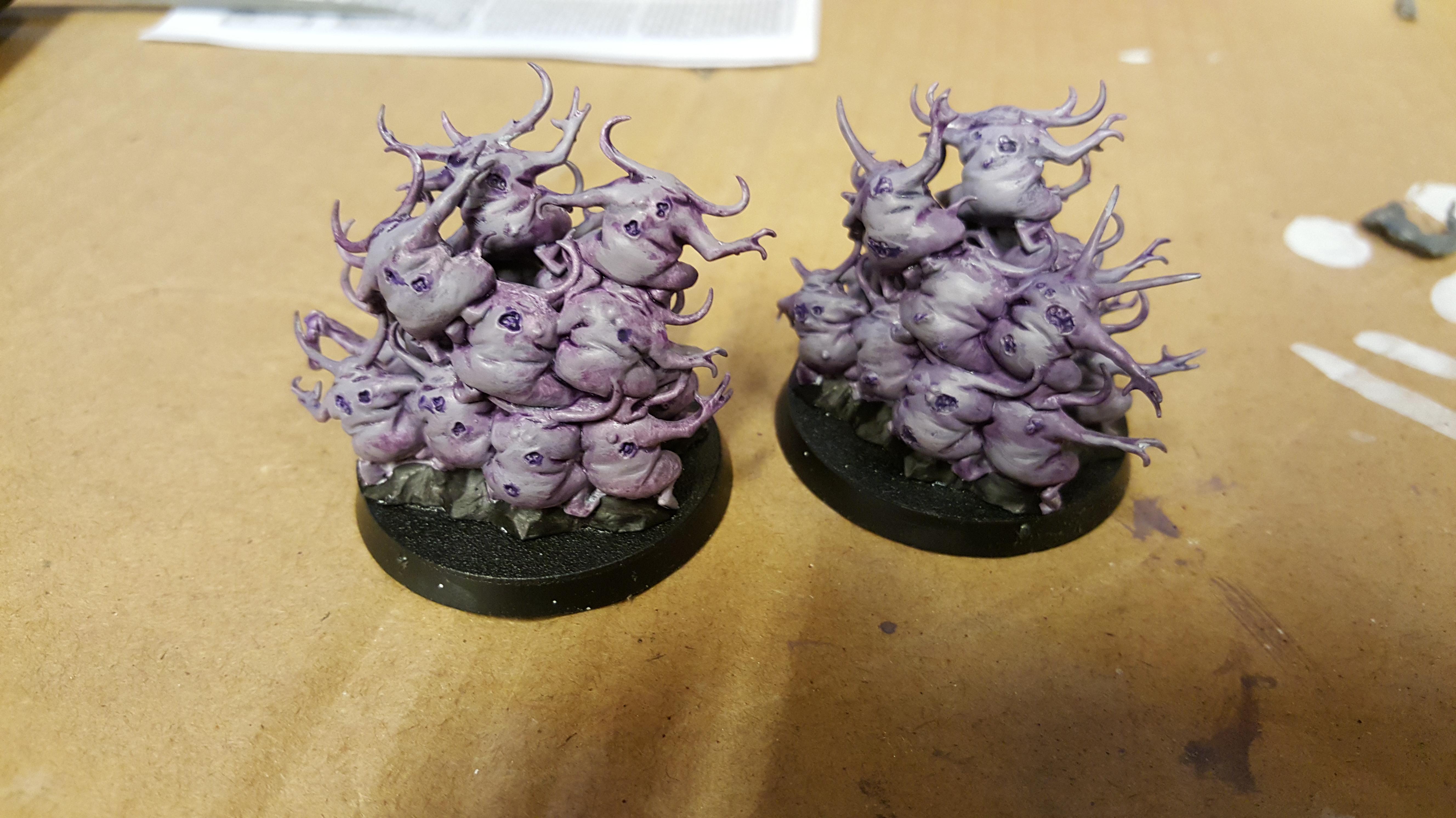 Yeah this is my first time painting, and Ive made sure to differ in style with each model, with my nurglings I made sure to highlight with a much darker purple in the fleshy holes and on the boils, in conparison my daemonettes are black and a more lighter purple. There are still alot of touch-ups I have to complete on both units but Im satisfied with how they are looking for now, so you think an even lighter purple for the bloodletters?