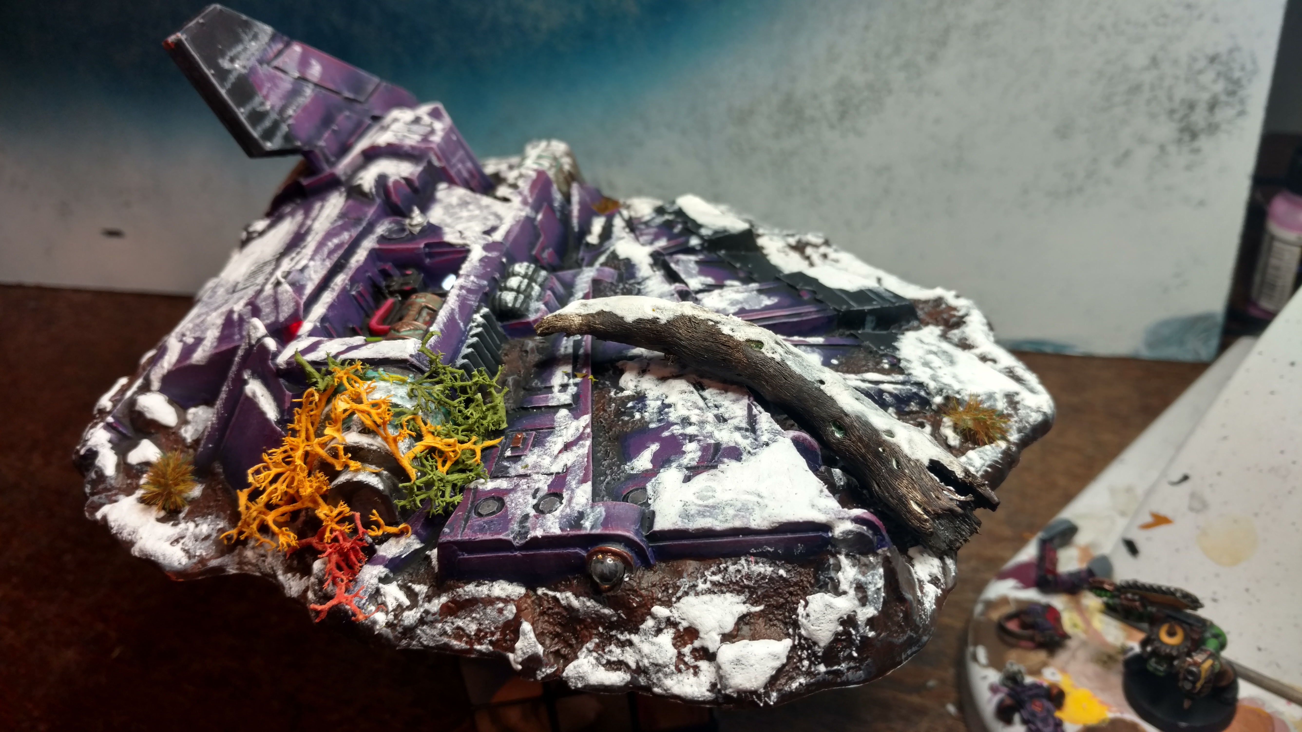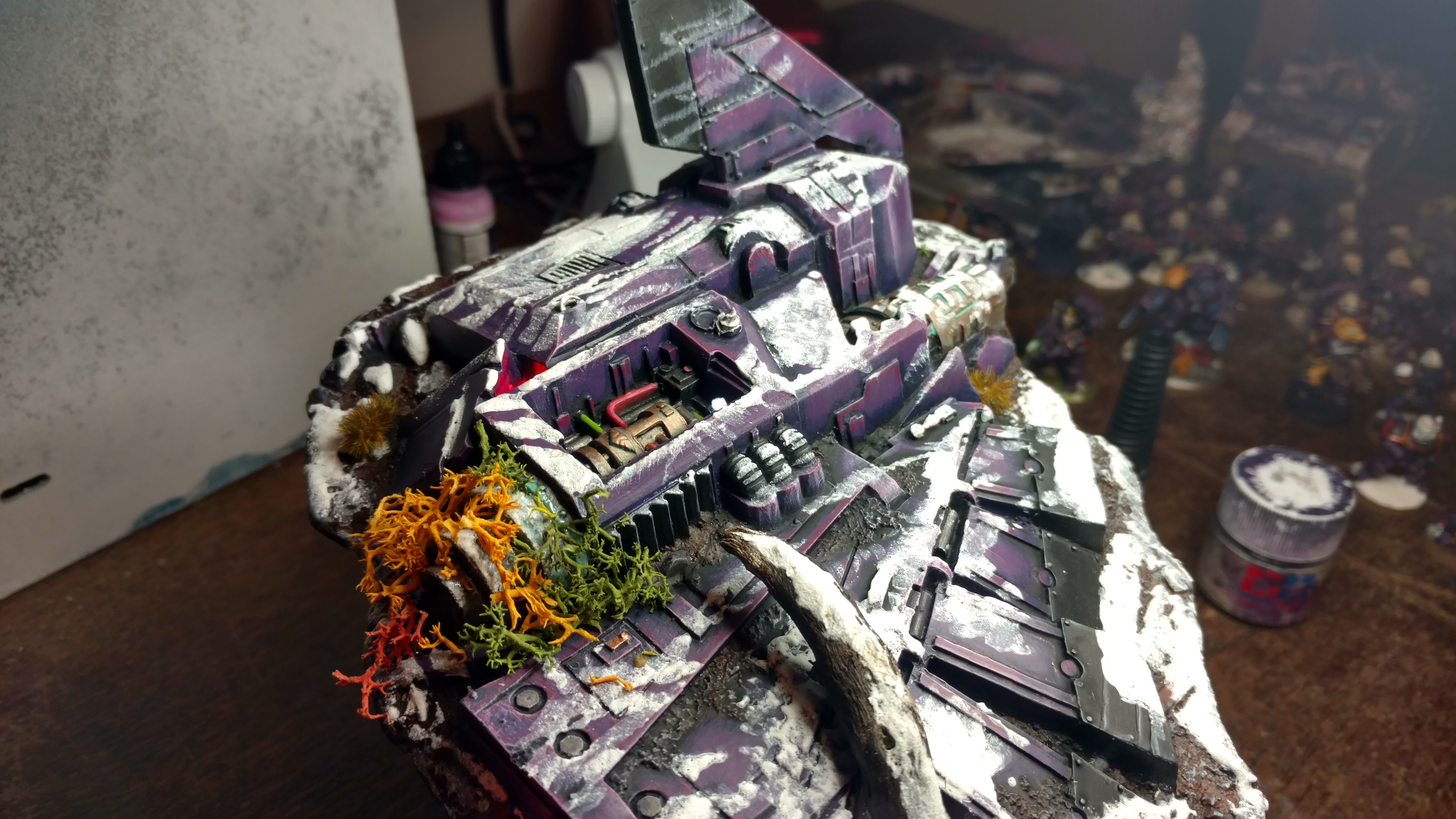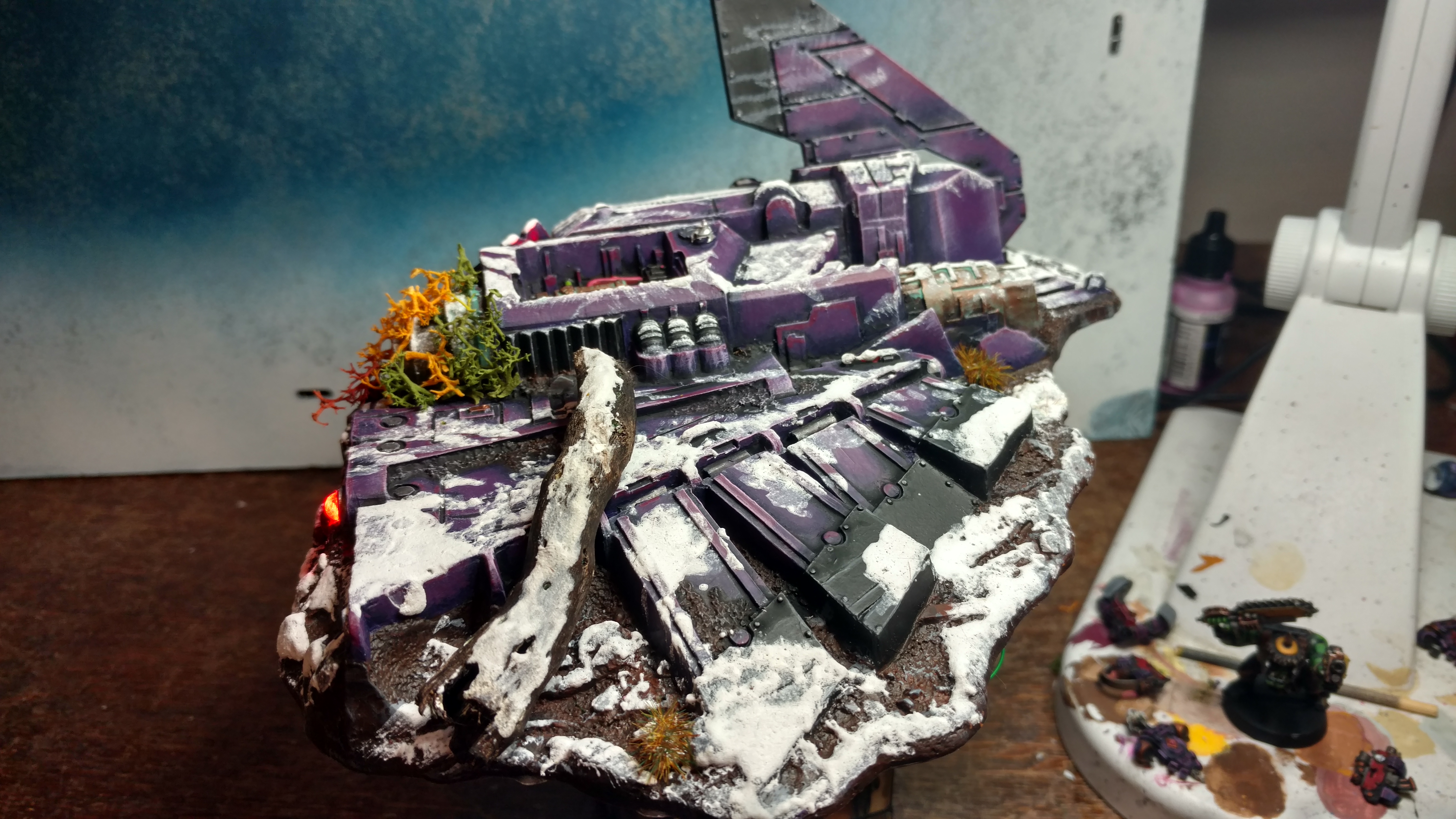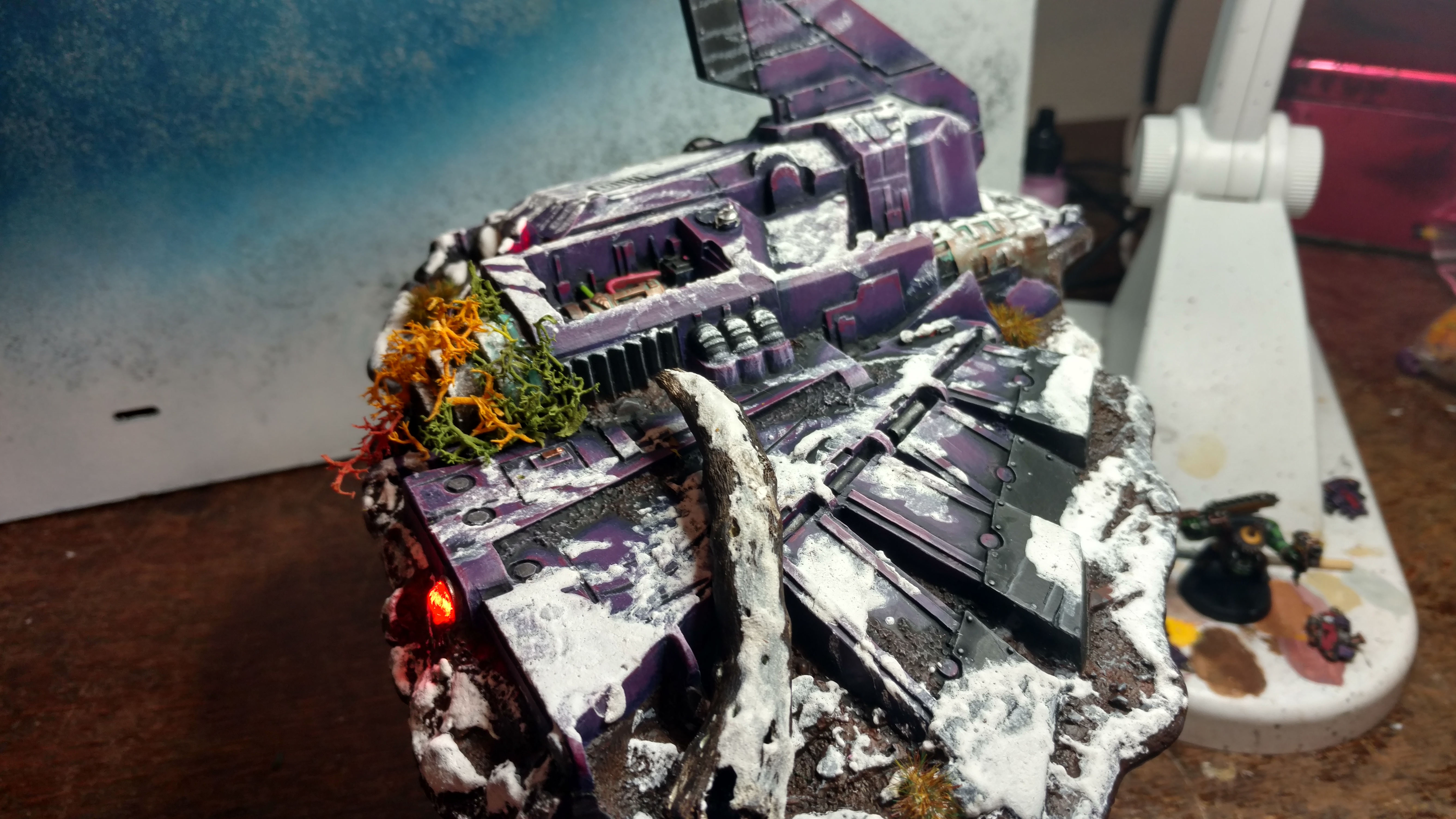 I'm not sure wolves have ever flown Aquilas in the fluff, I don't really care either. It's my model and I'll do it my way, that includes my purple space wolves custom company colour scheme. Meh its half covered in snow anyway. I've fitted 2 blinking LEDs to the wing and a white LED in the engine/motor area. Let me know what you think, I plan to make more fenrisian scenery.