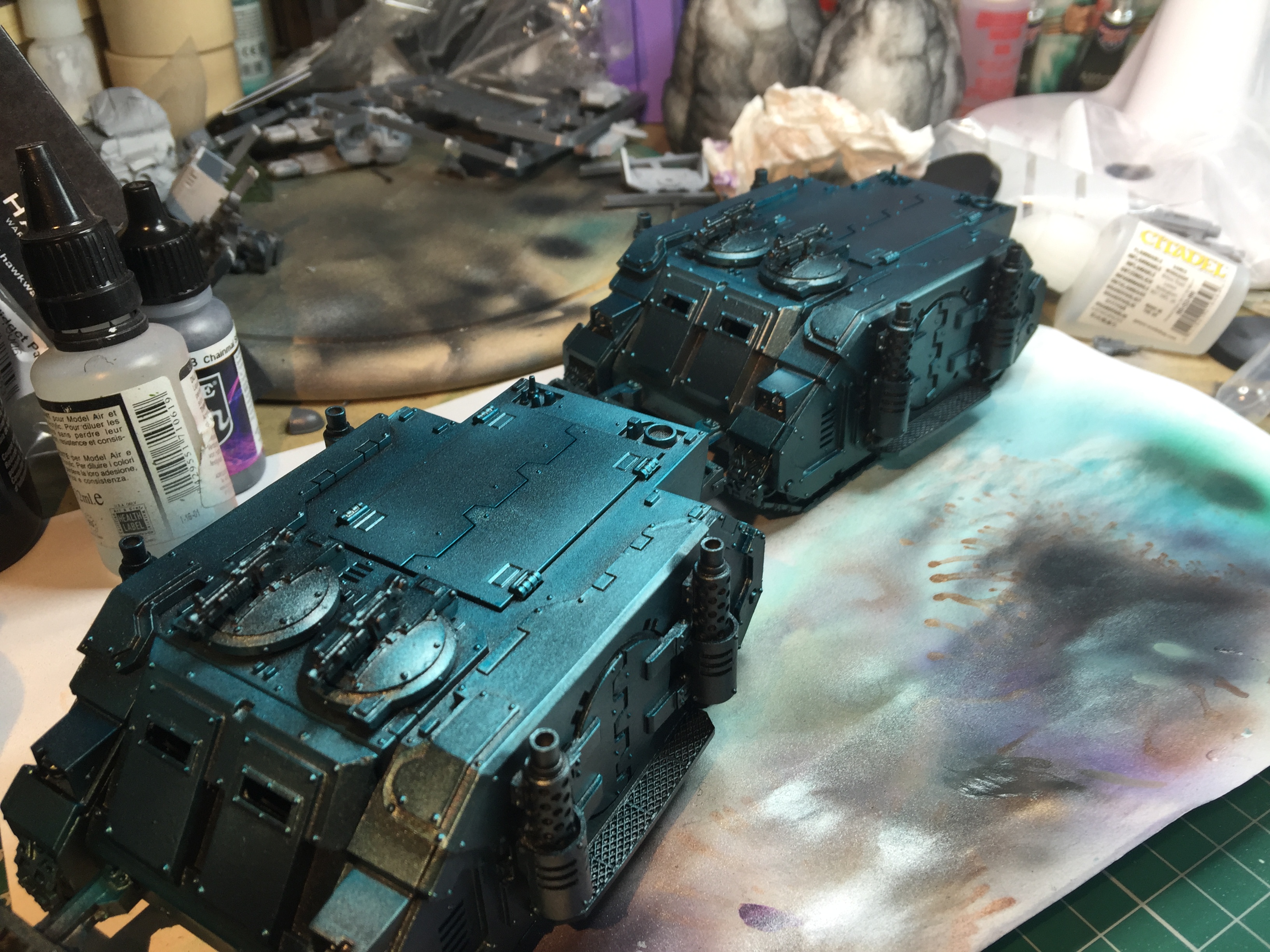 6. All that crap in the background? Get rid of it. Make a clean painting area, and try to get some lighting or a light box. This is a really great technique, but this step up was really too dark to see the transitions from the dark metallic silver, to the bright metallic silver, and then the candy coats. I could barely tell that the bottom half of the model was green, and the top half blue. Better lighting would show this contrast much more strongly!