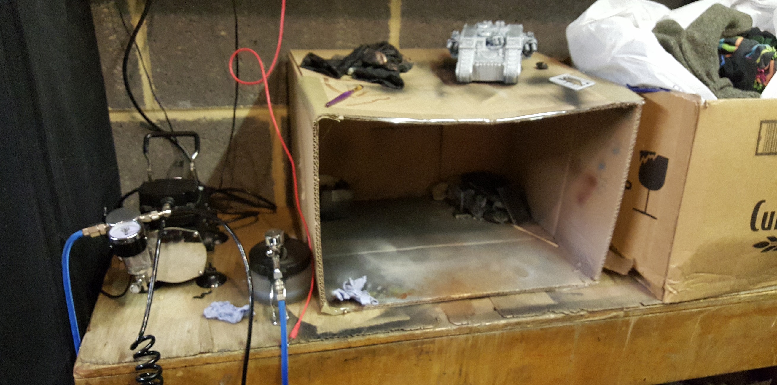 Hey gang. Im finding myself needing to prime and basecoat my models inside and I need a few ideas about coming up with something that I can use inside the house and paint or prime my minis. Show me your setup and tell me how you built it. I rather see home brew stuff because I cant afford to make any purchases right now and need to build something
