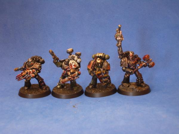 1) the style/tone is kept consistent across the force. Everything has heavy weathering, applied in the same manner regardless of base scheme, and that does a lot to provide a coherent element to the army. Likewise, elements shared across all 3 schemes are kept similar; all the metallics, eye lenses, pouches and holsters ect get done using the same methods. The overall look is also very dark, so the disparate colours don't clash as much as if they were more vibrant.