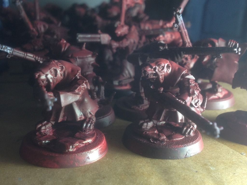 Red basecoat and zenithal highlights added to Rangers and black basecoat with first (of many) layers of orangey red tunics.