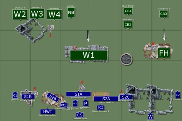 On the left, the two Chaos bikers and Flesh Hound advanced on Infantry Squad 2A, while the Nob bikers moved to the rear of the Chimera beside objective 1.