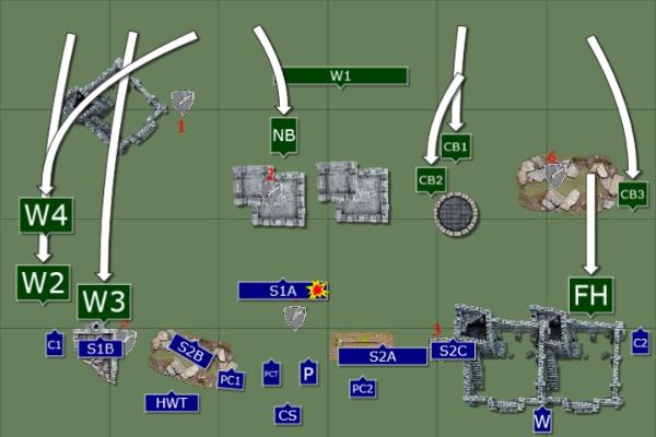 Infantry Squad 1B, the Heavy Weapons Team, the Command Squad and the Platoon command all fired at the Nob bikers, causing a wound on two of the Nobs, but failing to kill any of the unit.