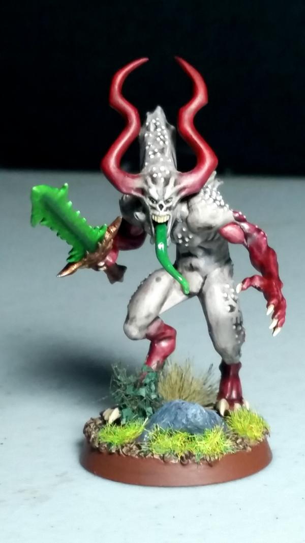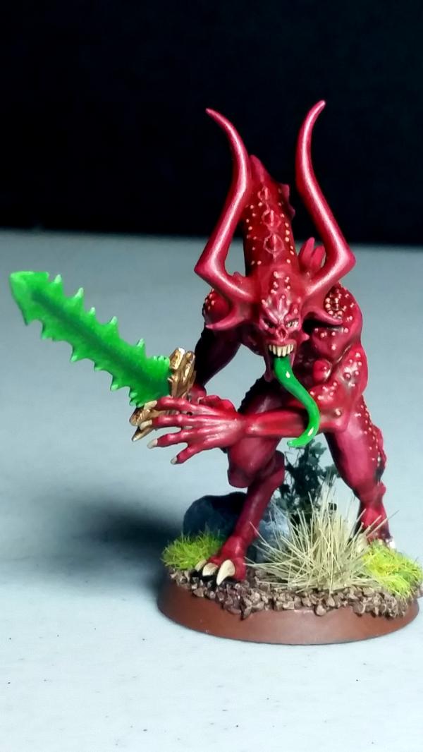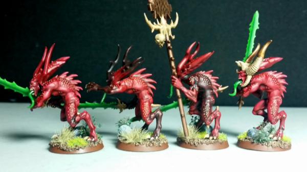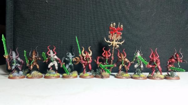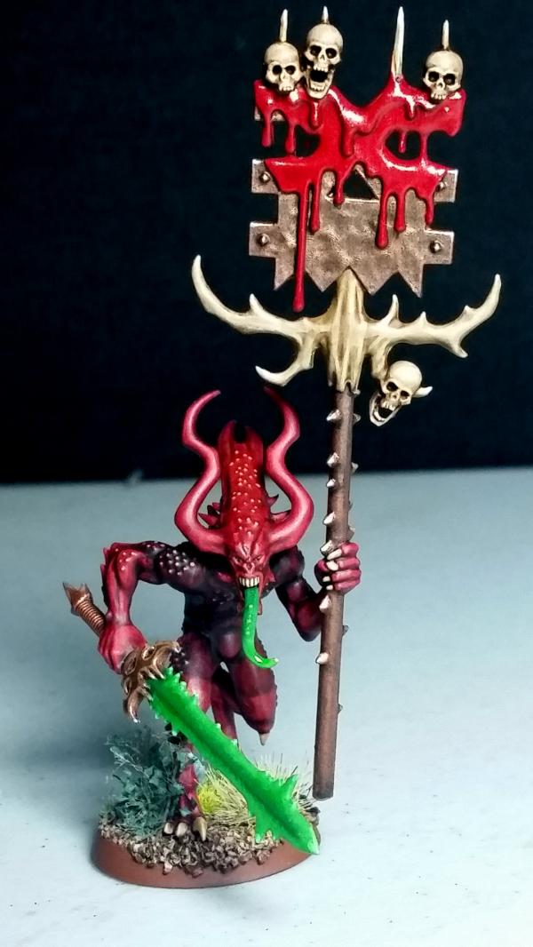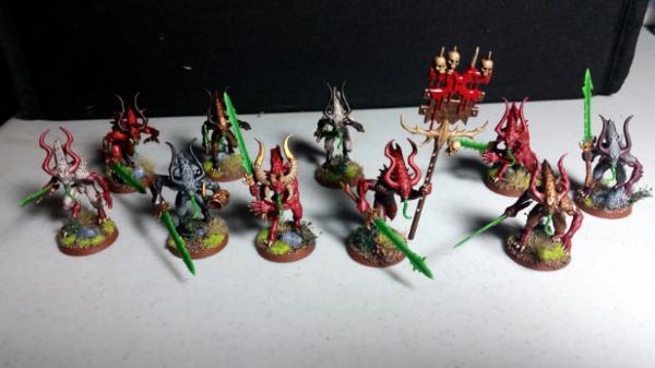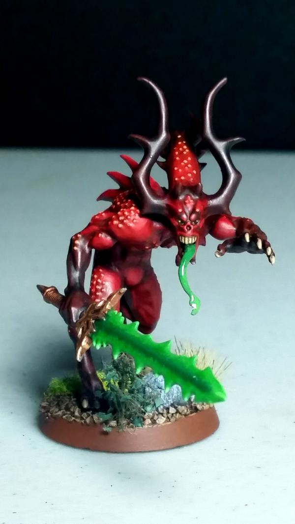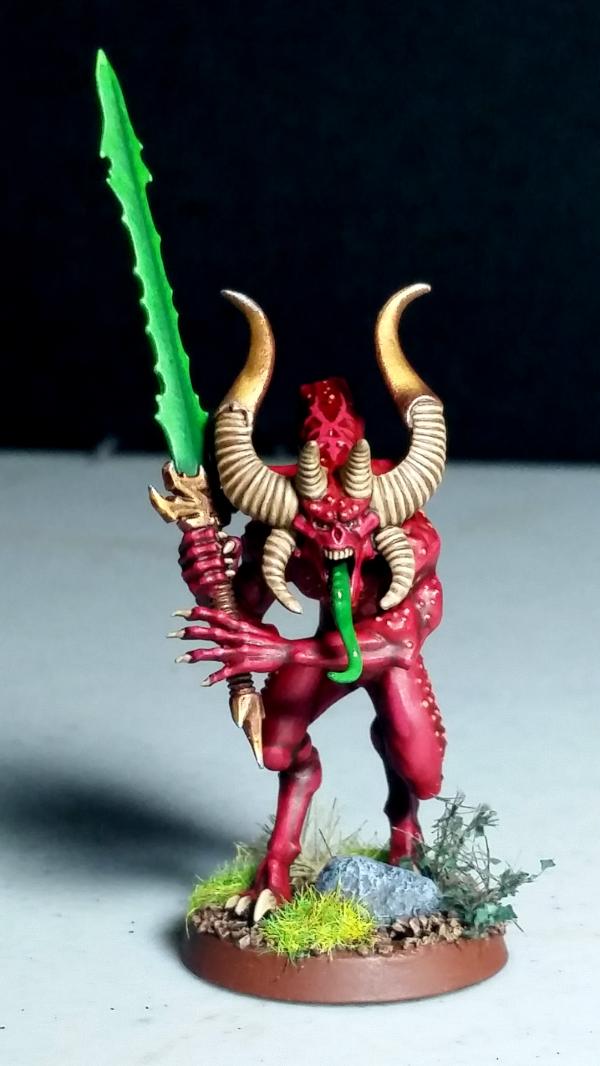 So I finally got these guys finished, and I'm pretty happy with them. I wanted them to look a little different than normal bloodletters, I get tired of only seeing Khorne stuff in red. I also wanted to go classic with the green hellblades. The weapon hafts are are gold to tie them into the