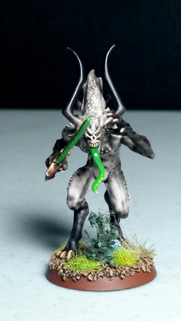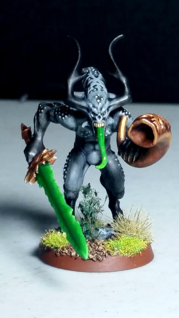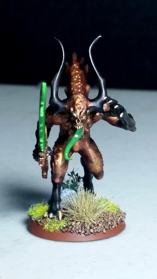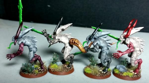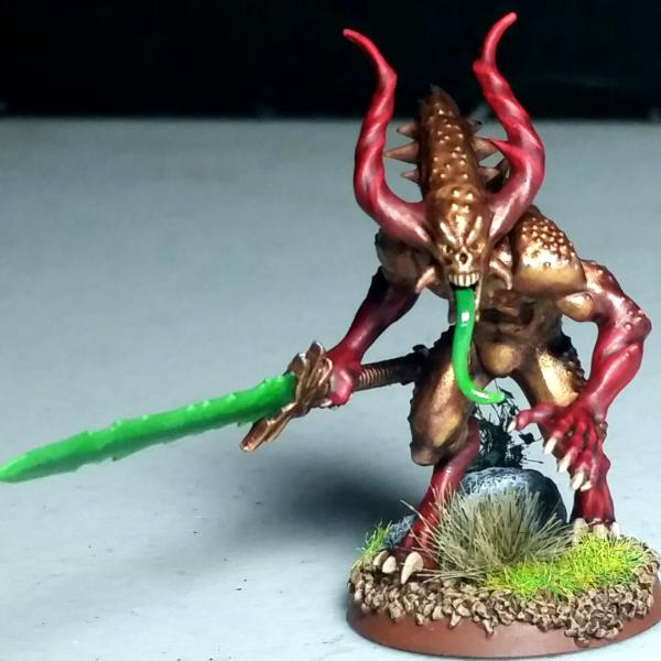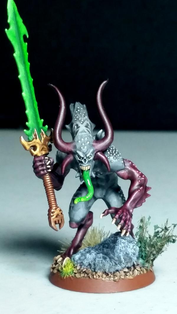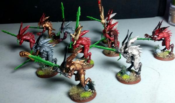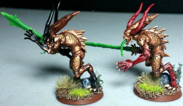 So I finally got these guys finished, and I'm pretty happy with them. I wanted them to look a little different than normal bloodletters, I get tired of only seeing Khorne stuff in red. I also wanted to go classic with the green hellblades. The weapon hafts are are gold to tie them into the