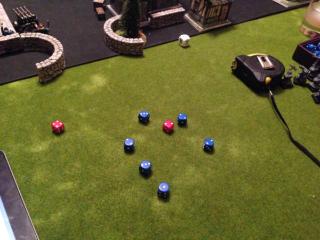 Skaven player wins the roll off. Moves the hell Pit Closer, and the storm Vermin as well, Monks move up cast the spell in the book of woes, Dwarfs suffer a wound , mortar team shoots and scores a big 5 for damage, ouch, 3 dwarfs left. Combat results in miners moving up and storm-vermin charging in. Standing still Iron Breakers are nice, re-roll saves resulted in 1 dwarf dying alltogether, while 5 storm-vermin in swing back had their heads cut off. Battle Shocks were passed by both, not sure how.... but we got lucky I am almost certain of it.... maybe we forgot....