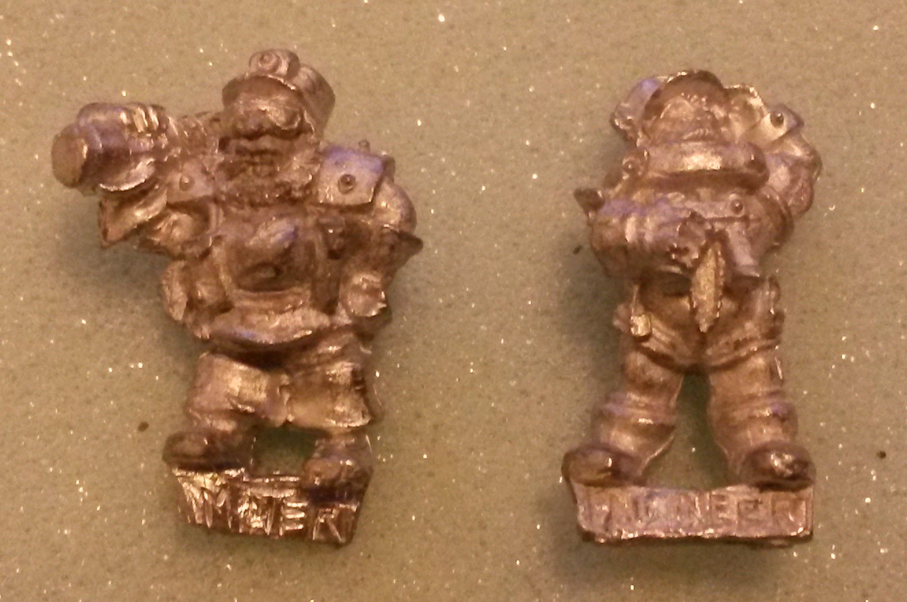 I suspect they are GW Squats from the Iron Claw Range (they have GW stamped on the tags). One is an 'Engineer' and seems to be holding some sort of binoculars. The second is probably a Mole Mortar crewman as he's holding a mole mortar shell over his shoulder. I have never seen these miniatures before. Can anyone help?