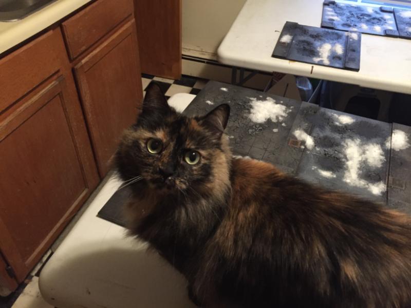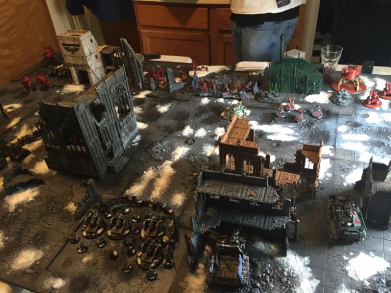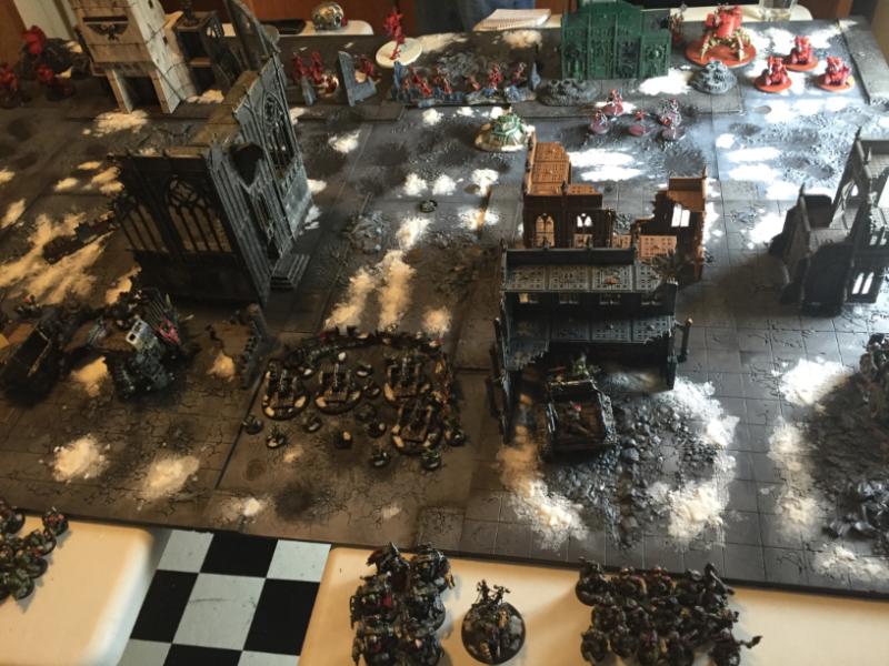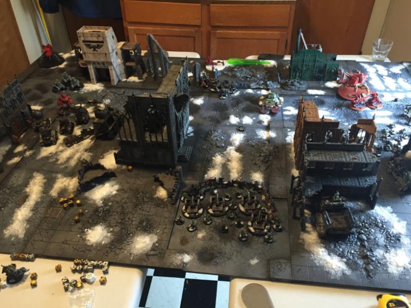 We rolled up Big Guns Never Tire, with three objectives, which we placed all down the middle. We went with Dawn of War because other deployments are hard to play with in my cramped little kitchen. Here's the city of Skullingrad, before the battle started: