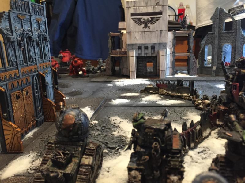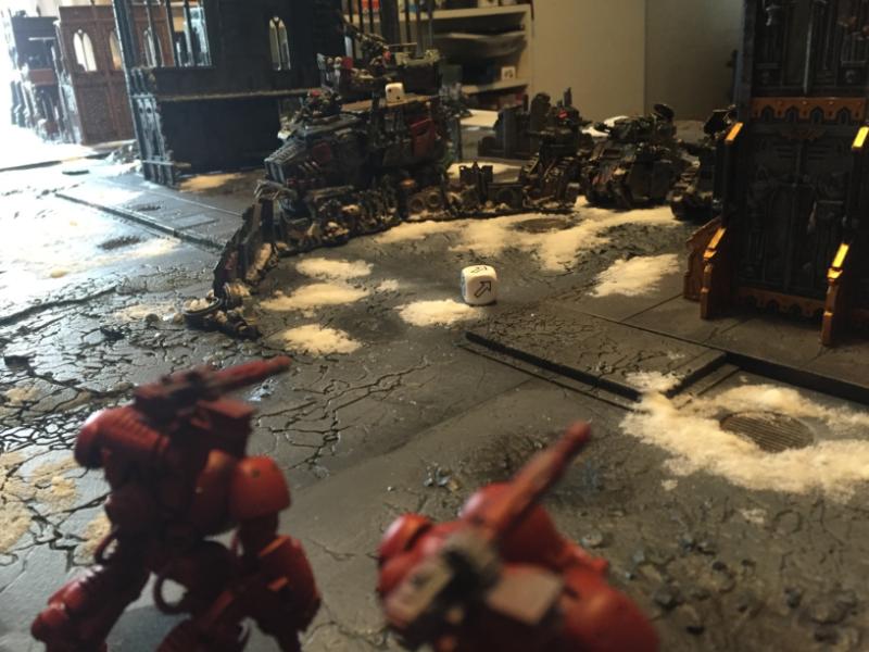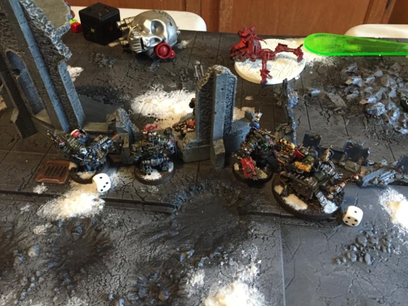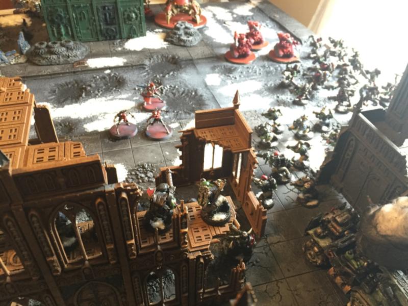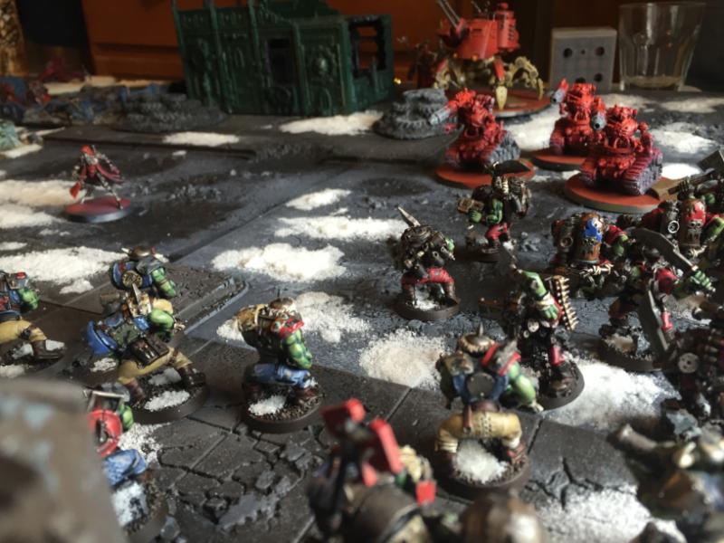 The turn ended with one Ruststalker going down to Ork shooting and the Orks advancing across most of the board.