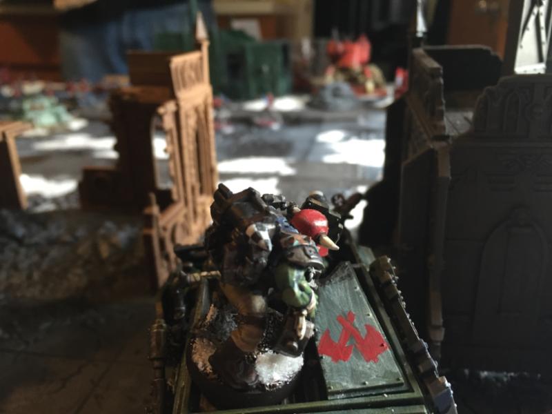 Our forces were on the table, the mission to capture the central street was clear, and we went on with the battle! Turn 1 one of my trukks bogged down and the boyz had to get out: