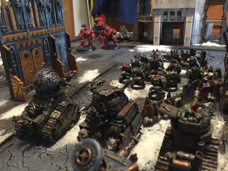 The grot tanks chew up the Kastellan robot before the boyz on that flank charge. The boyz are massacred but cause some damage.