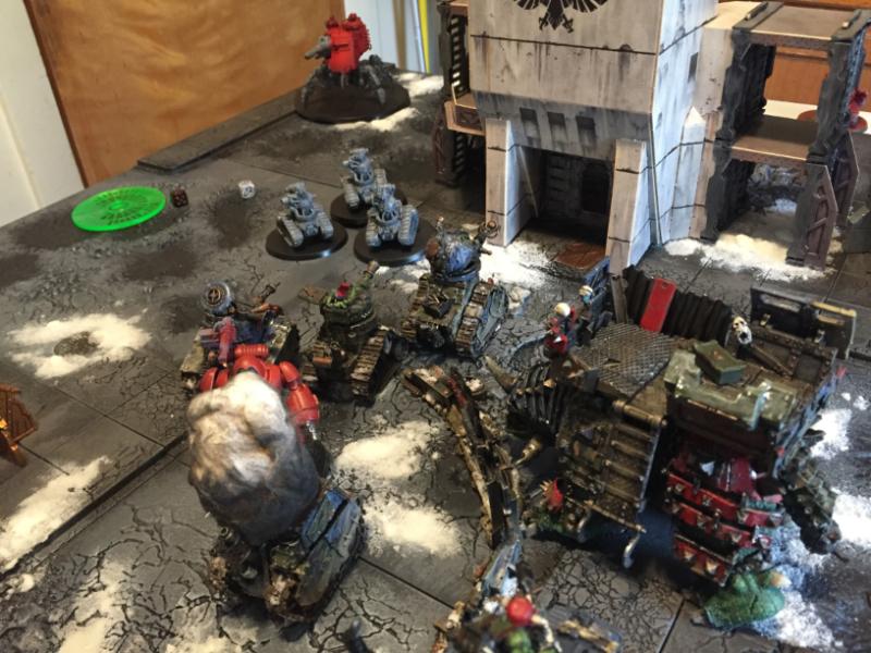 The Adeptus Mechanics forces are in trouble; their center has collapsed and while one flank has weathered the battle thus far, the Ork noose is tightening on the other. They try to protect their warlord while putting as much attention as possible on taking out the Meganobz.