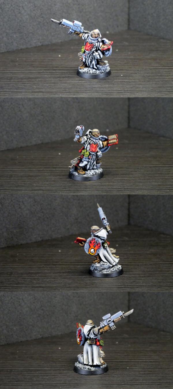 The idea is that his shield doubles as a melee weapon and instead of a rosarius he's a drunkard who survives by dumb luck which combined gives him the 4+ invuln save of a rosarius. I tried to give him a redd-ish nose and rosy cheeks to symbolise that but I'm not sure if it turned out well.