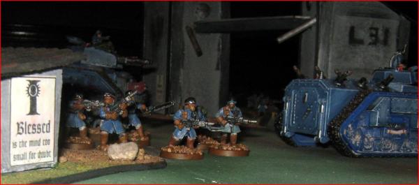 Steel Legion: The Original Bad Asses with Gas Masks! I started collecting them when Codex: Armageddon came out. I think it was the Armoured Sentinel that really drew me in. Over that time I have built up a fair force of about 3000+pts, and growing. I really liked the look of the models, gas masks, goggles, cool lasguns. The figures themselves had some interesting poses as well. Overall the idea of a mechanised force sounded really cool. And I believe that at the time they came out it was their 'special rule' to be able to take Armoured Fist Squads. So they really did have a different look and feel to other Guard regiments. I personally opted for a different paint scheme than the studio one. I felt that the ash wastes and urban areas would tend towards being grey, so they got a blue/grey look. I harbour no ill will towards any of the other regiments, but don't feel drawn to any either. All of the infantry models are still metal only, and I doubt they will ever see a redo in plastic. I believe that the whole line is still available from the GW webstore; with the exception of the alternate Commander, alternate Sgt, Commissar, and perhaps the grenade launcher trooper. Luckily the heavy weapon teams (excluding the Missile Launcher) are rather easy to convert if you were so inclined; just swap the weapon. As well, the DKoK line can sub in for special models, or veterens quite well. Here's a couple pics. I really should finally get around to taking some good 'Gallery' shots of these guys some day.