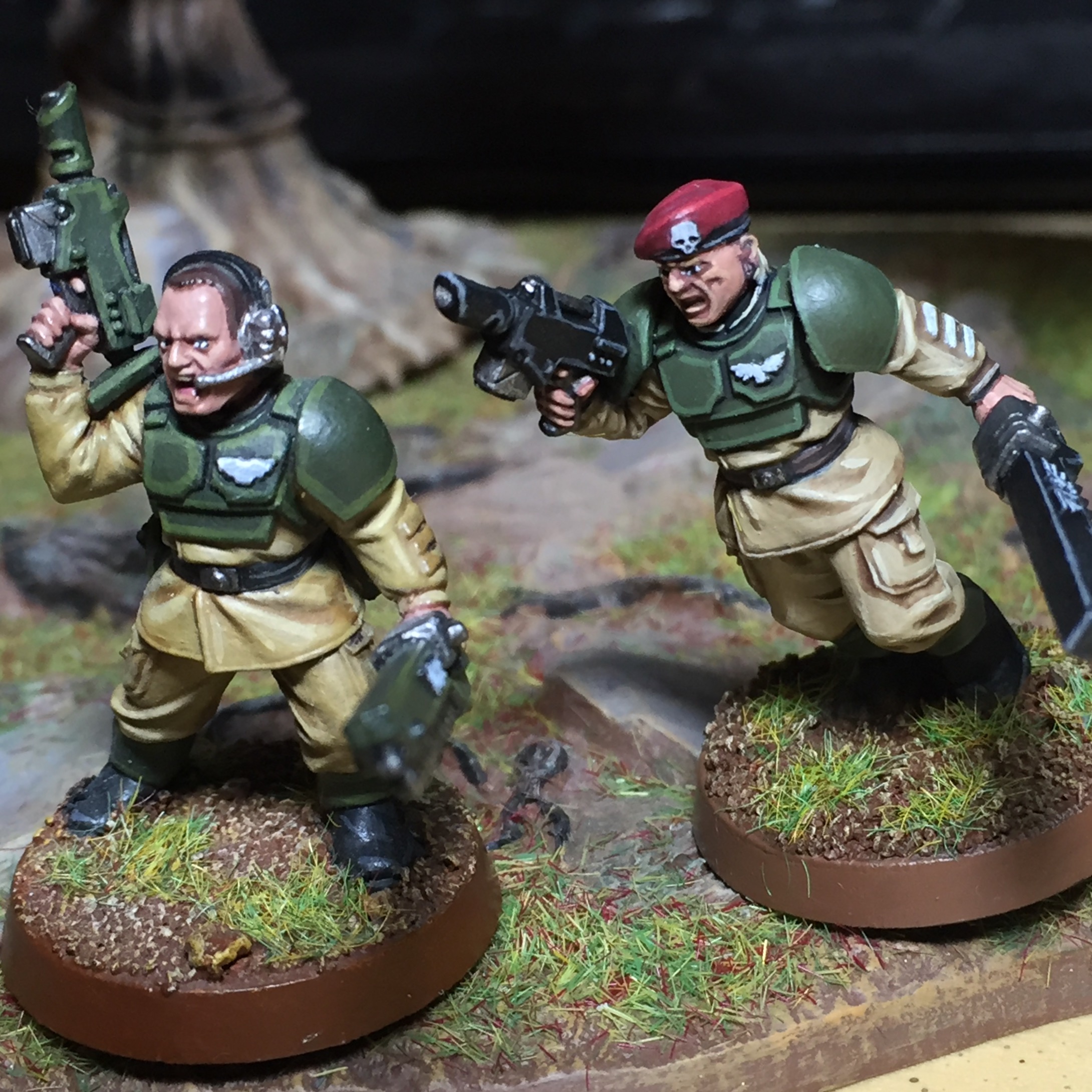 I finished the second sergeant of the platoon tonight. The first I've painted using the techniques in the How To Paint Cadian Shock Troops YouTube video. I am *so* happy with how his khakis came out. The photo doesn't do it justice. The new guy is on the right.
