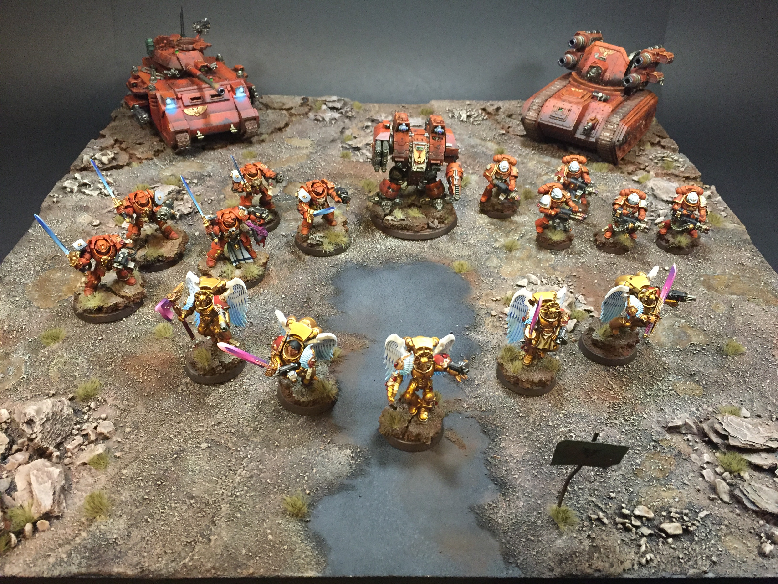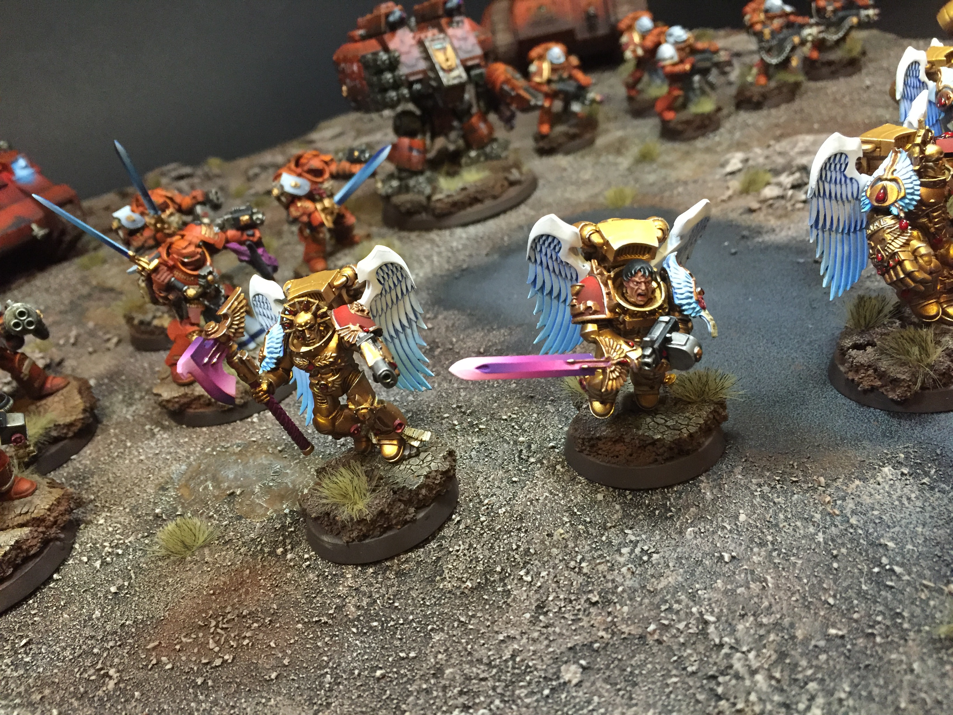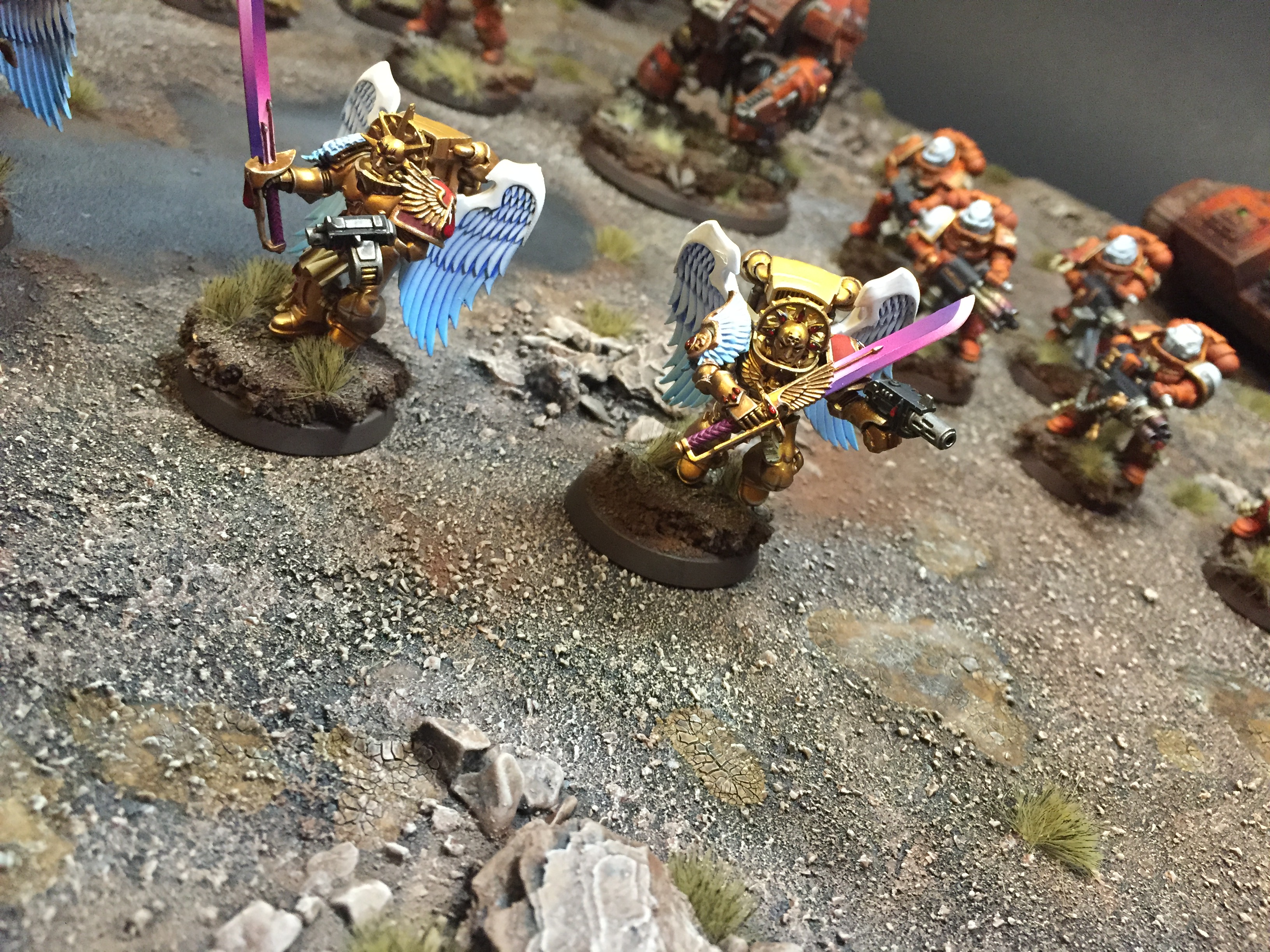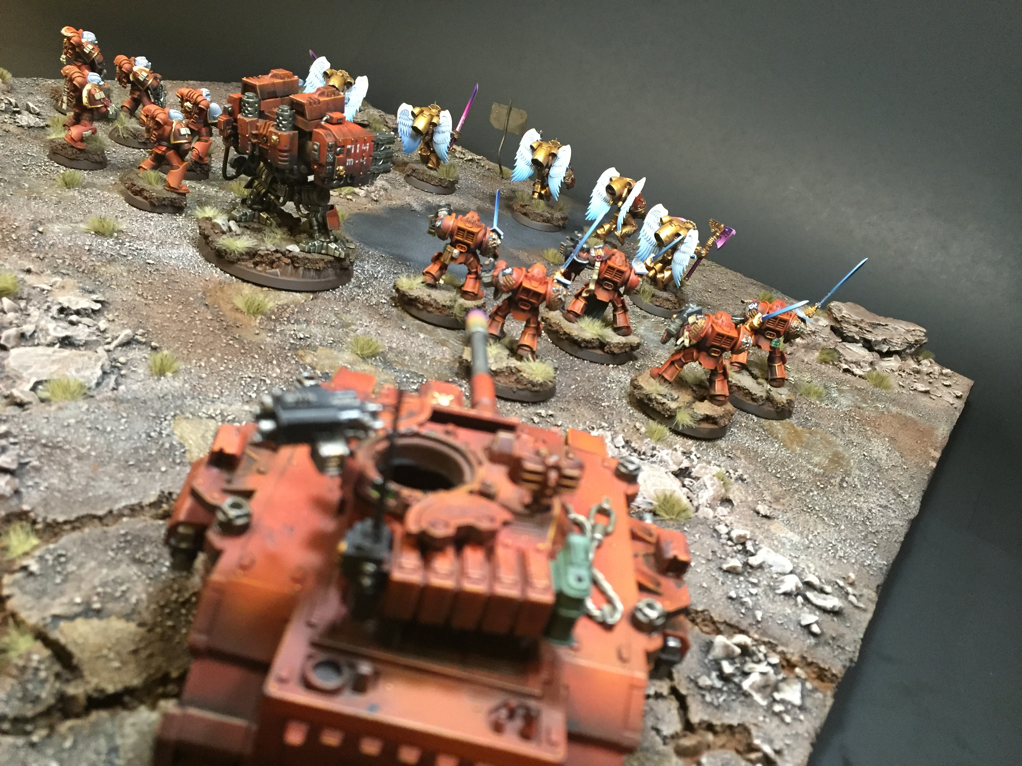 I took a hiatus from a lot of things in order to complete this piece. I took a break from lifting, ate nothing but maggoty bread for three stinking days, and smelled man flesh as I tracked a party of three through the realm of Rohan  Here is the final result. I chose models that I liked, and I pieced them together in one of my favorite factions of the Adeptus Astartes, the Blood Angels. I like to think of this as an elite strike force in a wasteland, one that could choose any weapon or equipment from the armories of the Imperium in order to combat the enemies of man.  Pic heavy, hope you enjoy!