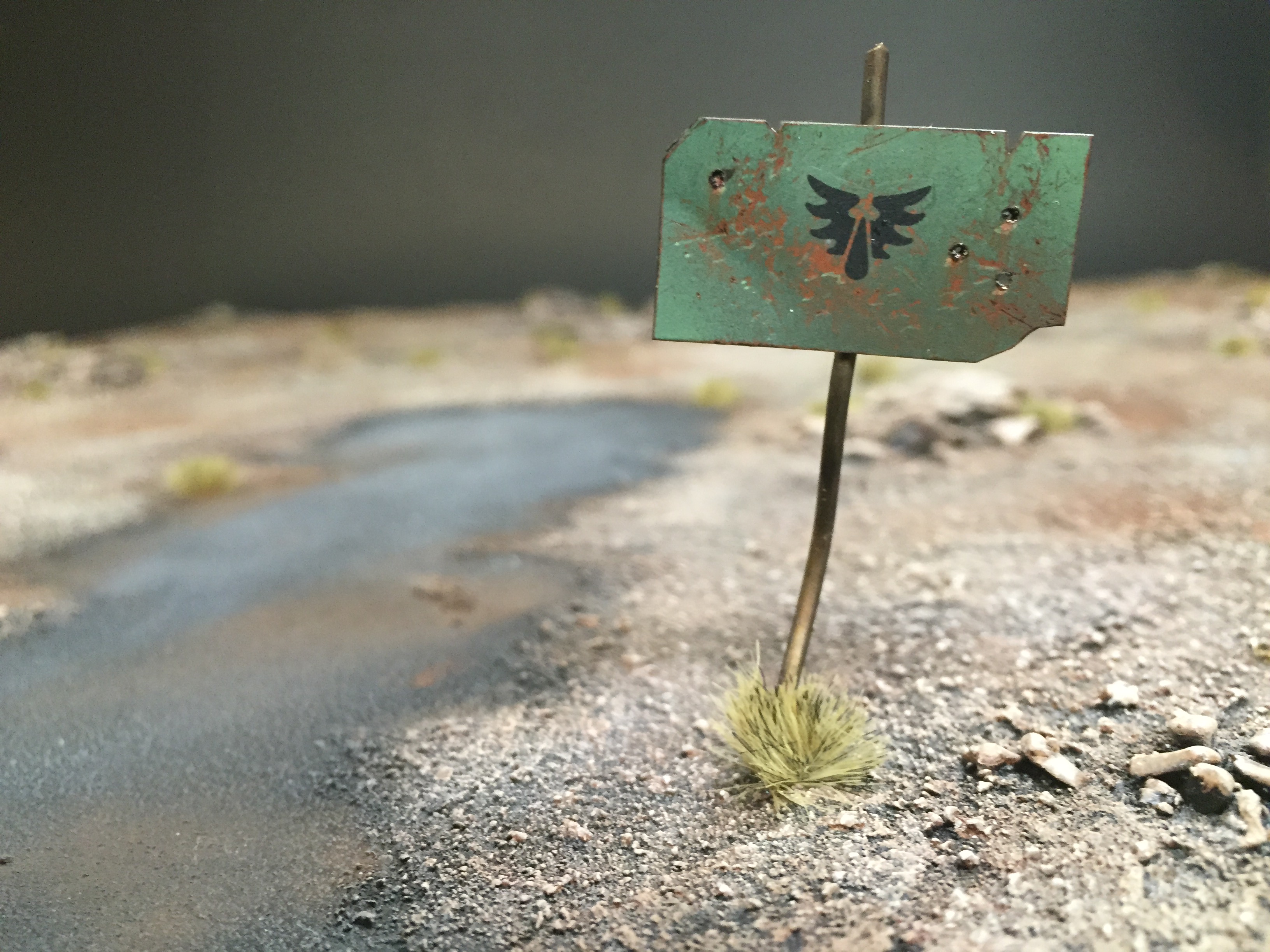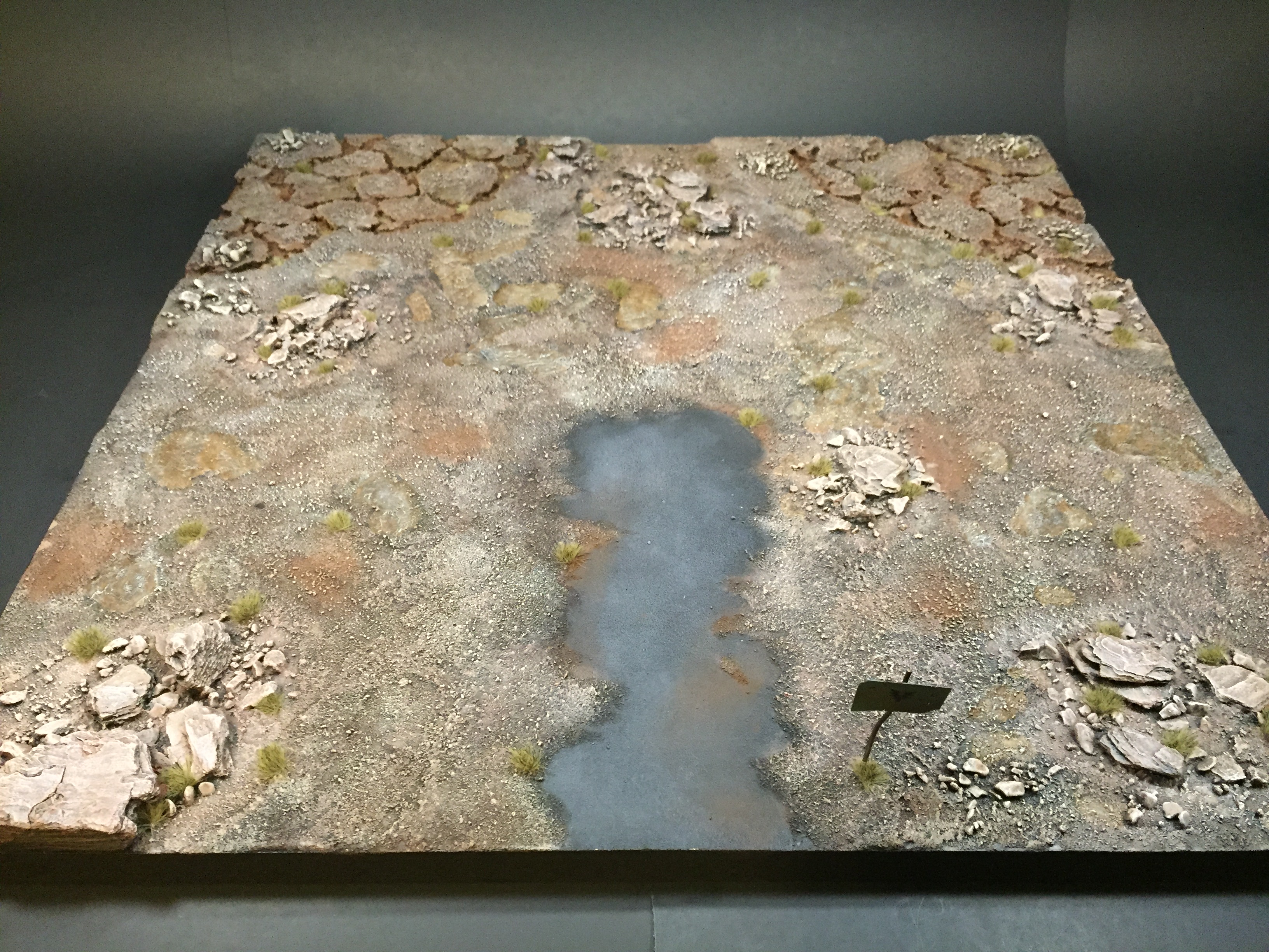 I constructed the board using a sheet of plywood,20"x20", then used wall filler for the contours. Cork board for the big cracks. After the wall filler dries, sand it so that it is all smooth, otherwise it will look clumpy. The add large rocks (pine bark) medium rocks, aquarium rocks, large grit sand, then small grit sand. Leave some blank areas to add Argellan earth (I know I spelled that wrong). The road is 150 grit sandpaper. Then paint to whatever color you want , I chose dark brown, light brown, cream