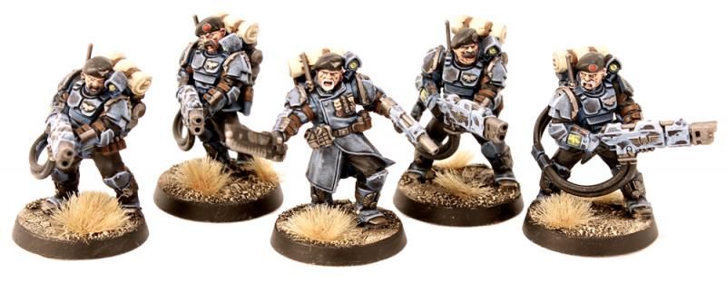 These are 4 Sergeants who will be the leaders of my first 4 Infantry/Veteran Squads! After a lot of time I've decided to go with a urban style uniform I really like, after discarding other styles. I'll explain the reason for it to being so dark in some fluff I'll post soon. Also, they have the Scions beret heads, I thought they would look great on the Sergeants.