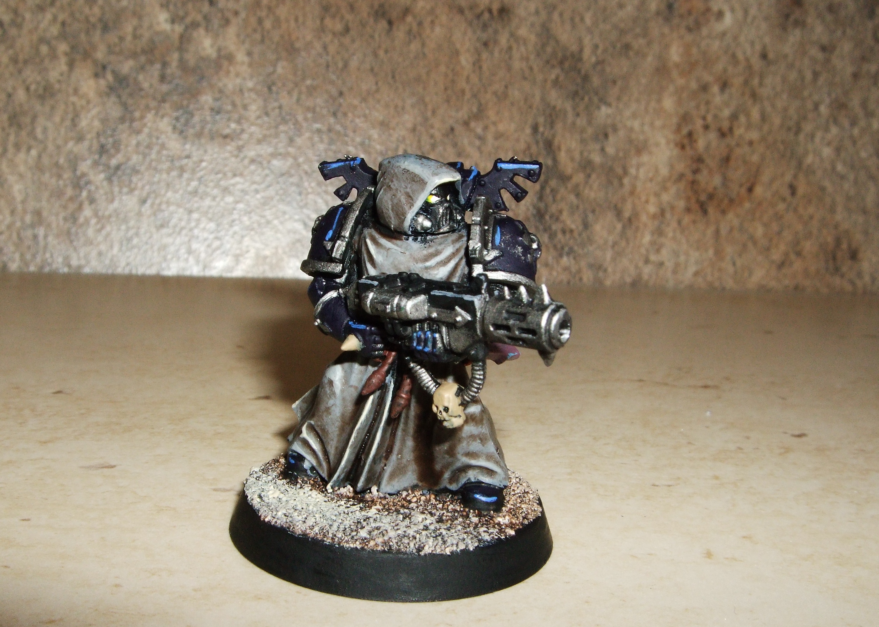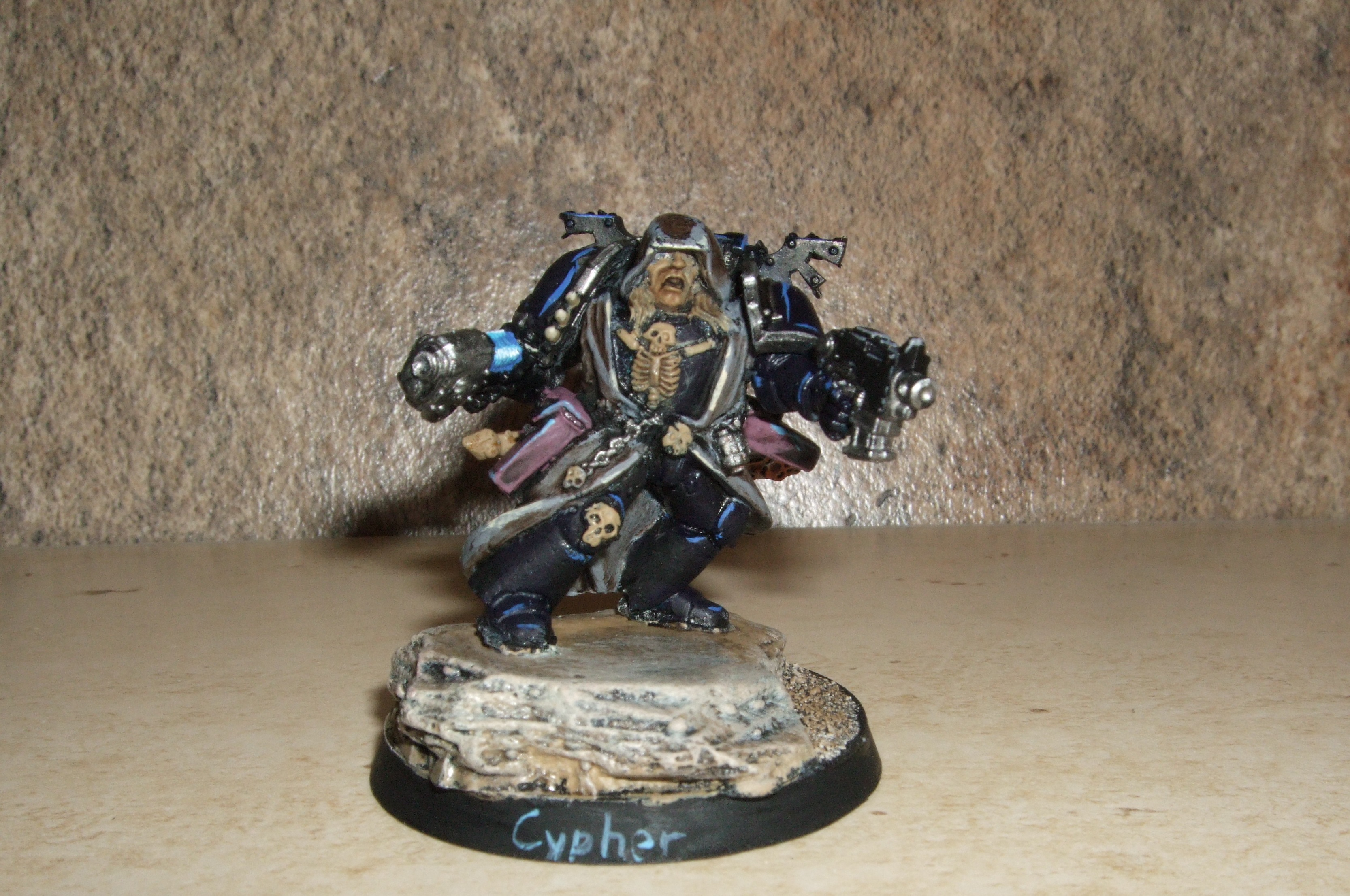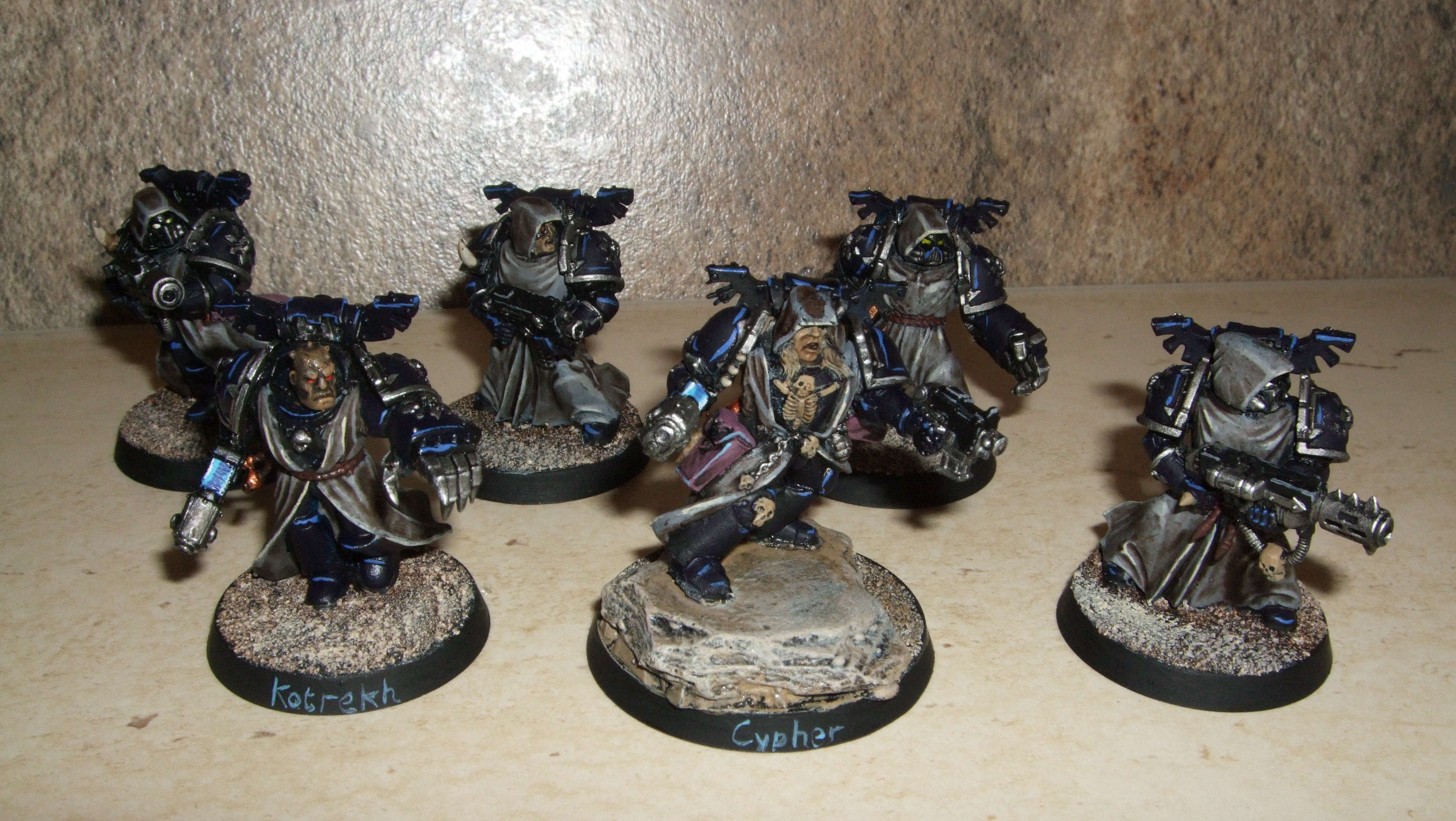 I've had this metal Cypher since about 1999, and he had a fairly decent paintjob, but recently, I saw the Dark Angels veterans box and though it was about time I made some Fallen Angels to accompany him into battle. It's only taken me 16 years to get around to it, but they're done and ready to go to war. I even gave Cypher some new arms while I was at it.