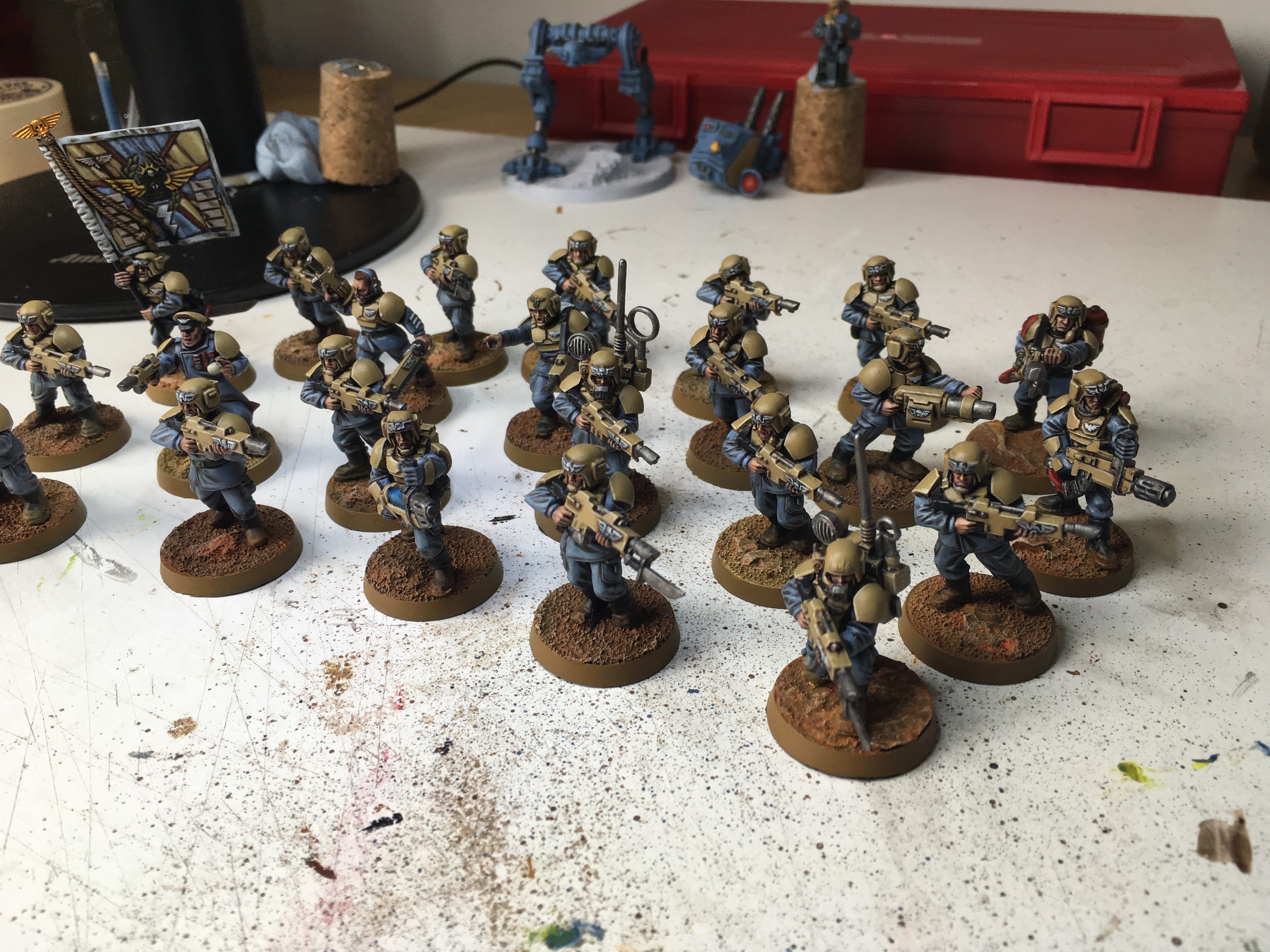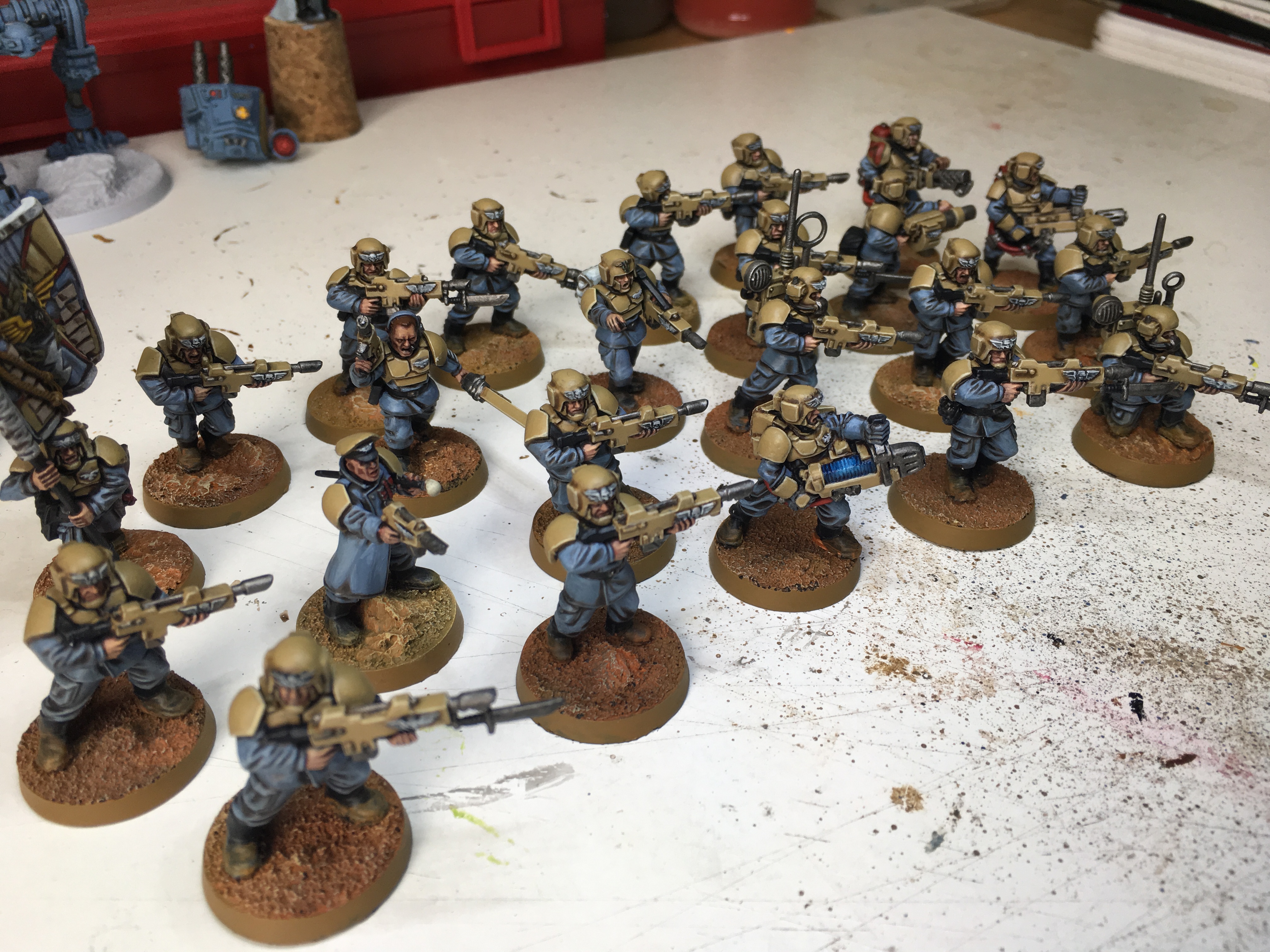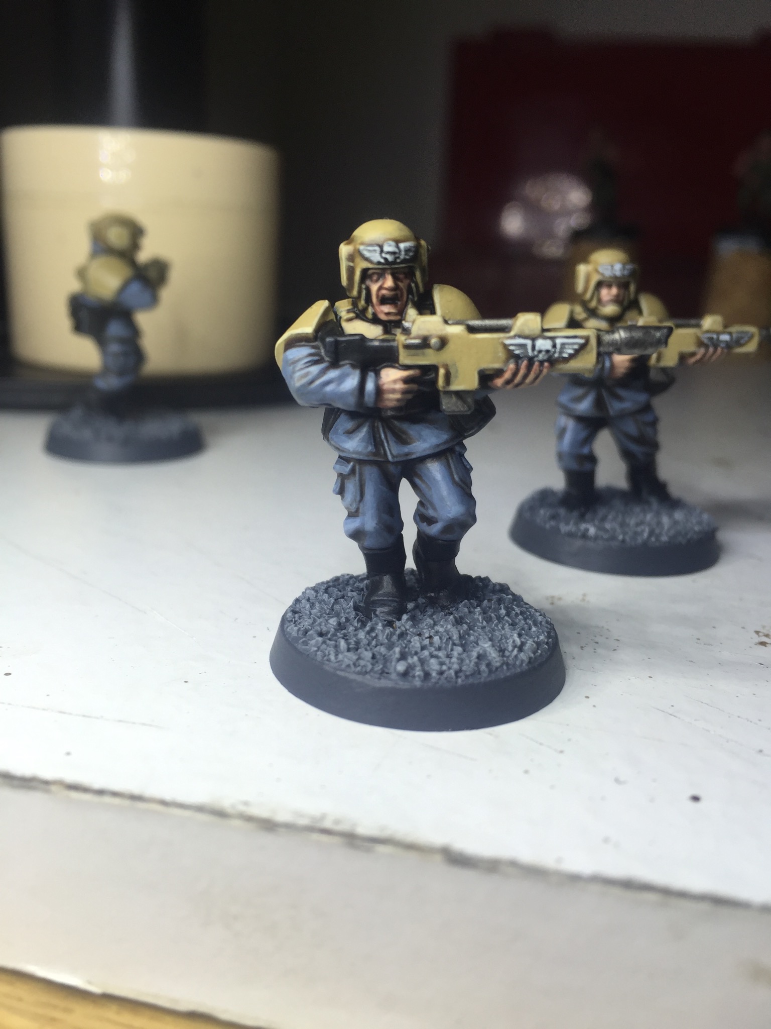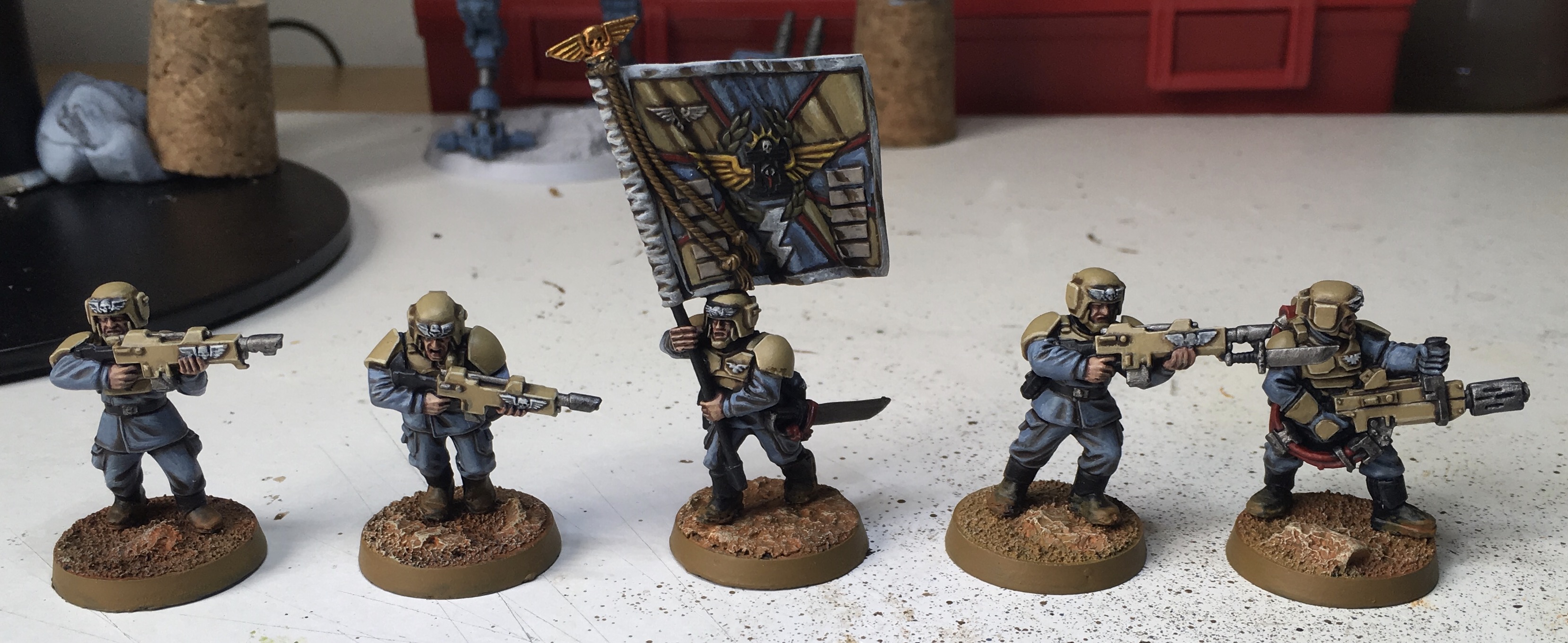 They look very good. Subtle shading on the tan colours and the uniform has nice colours to it too, there's more work in those models than you assume at first glance. It looks like a scheme that will suit any IG army once they are assembled en-masse.
