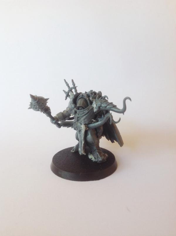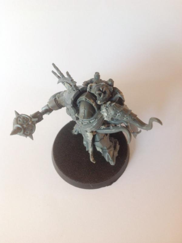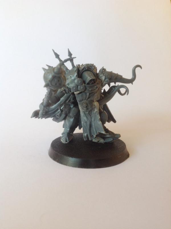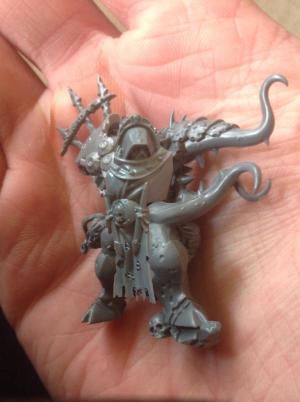 Spent an inordinate amount of time carving up plastic yesterday, and managed to make a fair bit of progress on the composition front too. On the scraping front I remove a large chunk from the terminator torso so that the Nurgle "brooch" would fit flush(er) with the armour rather than just sit on top and stick out like a sore thumb. The knives got scraped off the belt, and the cloth got "nurgled" a bit (though more progress is needed there). I also had to chop up the original Spume model in order to fit the termi torso in. Most notably I cut the shoulder and the brooch away from the front or the torso and remove the original left hand side and neck of the model, reattaching the tentacle afterwards - there's no going back now