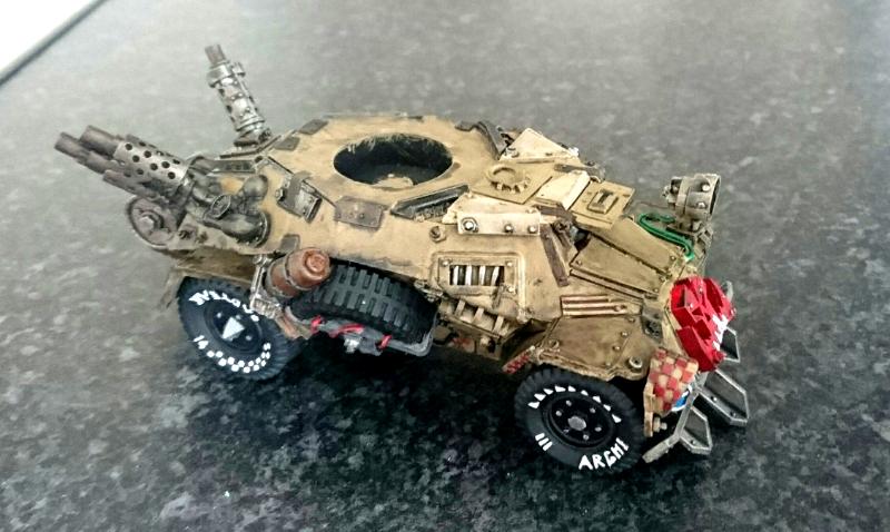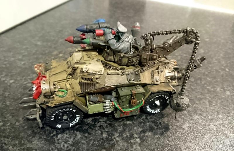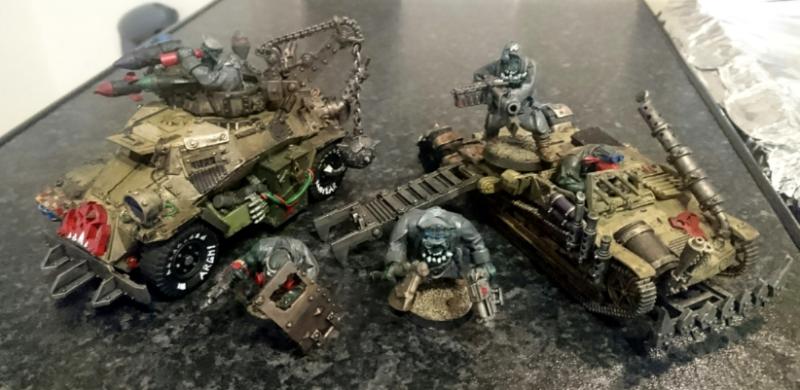 In order to gain some traction, as I would like at least 4 people playing, here is a quick guide to build your mob! Come on people, don't let my attempt at starting a campaign fail before it even starts! Will be looking at playing at 4 - 8 missions/scenarios in total, and 1 finale match. But those details will be discussed at a closer date. Building your Mob! Are you a Gorka? Or a Morka? If you feel the only way to beat your opponents is to whack them with a choppa, you are a Gorka. If you feel the need for speed, then you’re a Morka. Your mob will need a minimum of a nob, 2 boyz , spanner (1 per vehicle) and a vehicle. All your foot units need to be able to fit on the vehicle, so if they can’t physically fit, you’re gonna need a bigger boat. It doesn’t matter if there is no proper standing space on the vehicle, as long as they can fit and balance on the vehicle. You start with 100 teef. So the minimum cost will be: Nob… 12 teef 2 Boyz… 2x5 teef 1 Spanner… 6 teef Small buggy (can fit a maximum of 4 models)… 15 teef Total: 43 teef, which gives you 47 teef to upgrade your boyz and trukk Once you have built your mob, you will need to select who is the driver/s and who is the gunner/s. The driver choice is somewhat permanent; if you want to swap the driver later you will need to let them have a bar fight. I suggest labelling every model on the underside of the base to keep track of who is who, especially important for experience points. It's not always easy to play WYSIWYG, especially since equipment will change over the course of the campaign so it will not be a requirement. The costs of equipment and gubbins will be taken from the MWG modified rules, page 10 and 12 respectively. Example Mob List I'm gonna be a Morka cause I want to see my trukk run everyone over. Nob armed with a 'Uge Choppa and 'Eavy Armour... 12 + 2 + 7 = 21 Spanner armed with default knives and flak armour... 6 +2 = 8 Boy 1 armed with default knives and flak armour... 5 + 2 = 7 Boy 2 armed with a blunderbuss and flak armour... 5 + 1 + 2 = 8 Buggy with a rokkit launcher, wrecker ball... 15 + 13 + 10 = 38 Brings me to a total of 82 teef, leaving me with 18 teef. The spanner will be the assigned driver, and boy 1 is the gunner.