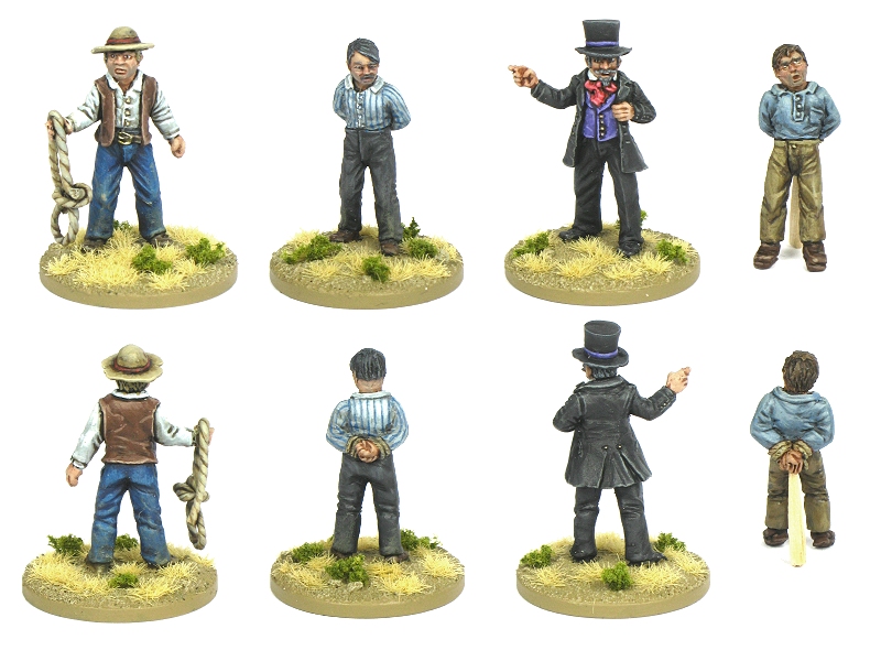 Just finished a quick and fun set of characters for my DMH games. Rope is greenstuff (tried string, looked awful). Guy on the right (propped up by the cutoff cocktail stick) is to be hanging from the 4ground gallows...