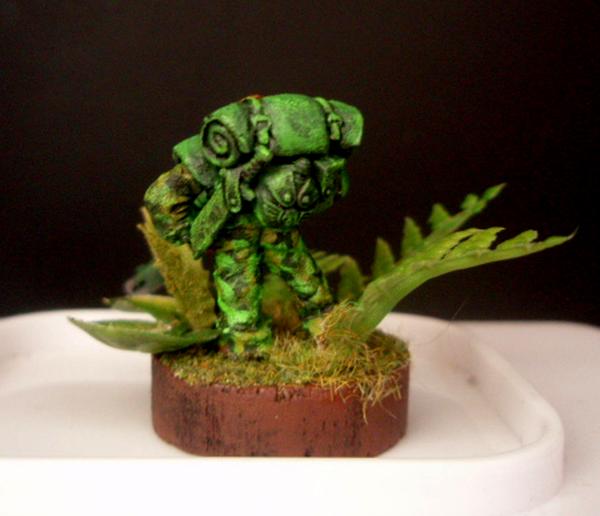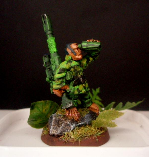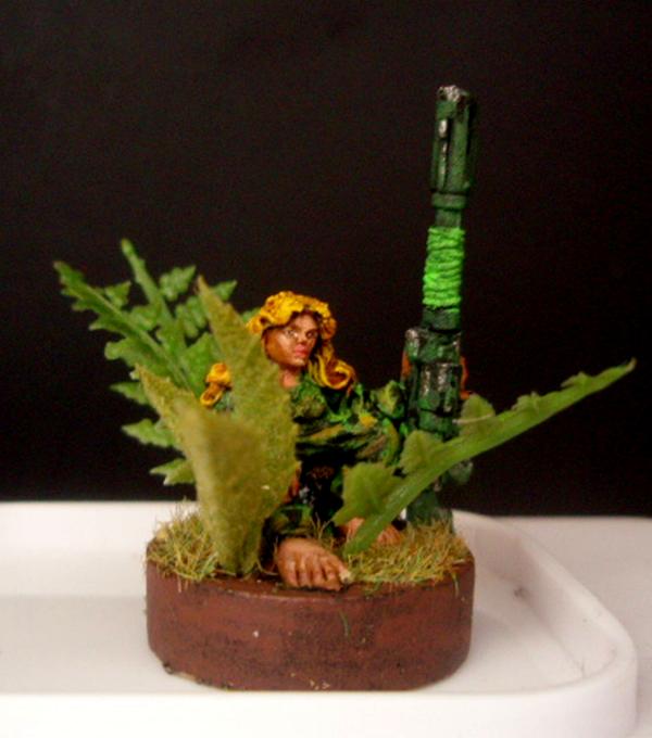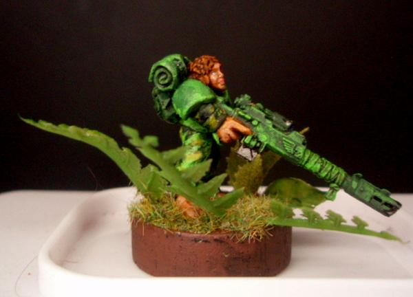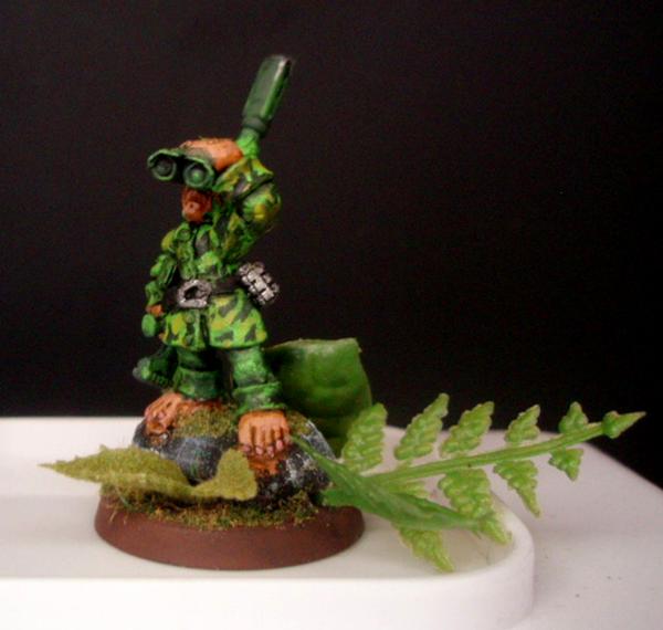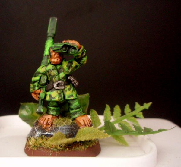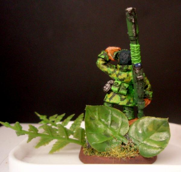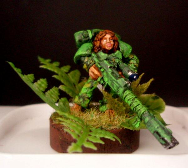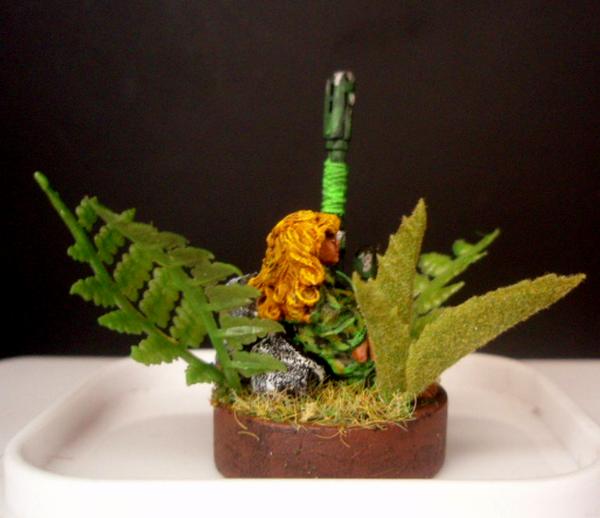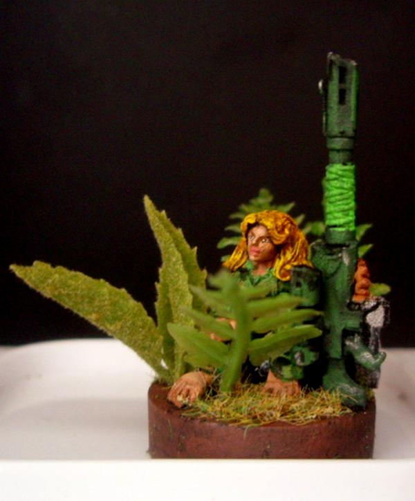 Here they are, the first set of three painted. That's the sarge with the binocs and nice sideburns. The other two are on their break...and yeah, a blond sniper is certainly at a disadvantage in the jungle, but hey even Murder Inc. gets a ten minute break. I should have given her a smoke...Anyway, this is the issue with painting real camo...the whole model is just mottled green! Which does fit in the jungle bases I made.