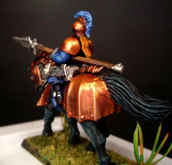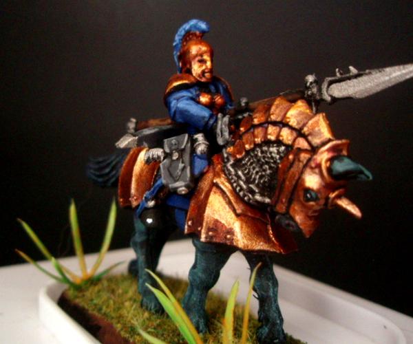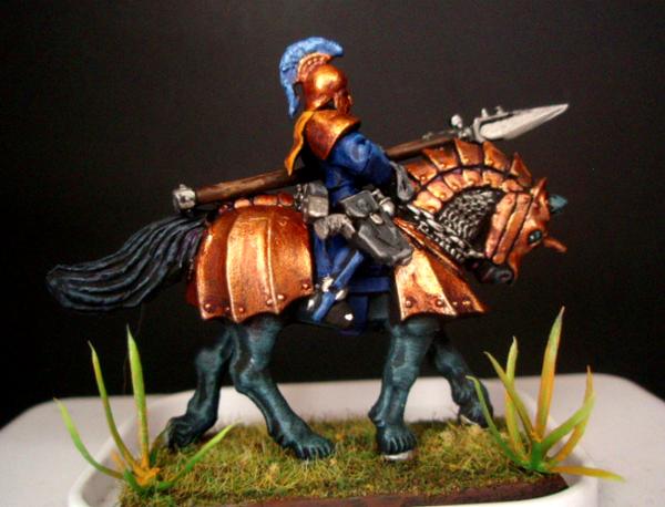 Here is the first painted rough rider from the first squad (they ride armored horses from the Empire Knights group). I went with a true metal bronze theme. I think it contrasts well with the dark mordian blue and black horse. If you care, I placed a bronze basecoat over black primer, then washed with druchi violet, re highlighted with bronze then put reflection on with a mix of bronze and gold (I tried a mithril silver and bronze and it was more silver than bright bronze). The horse is black over black primer with a coal black and then white with coal black mix. What do you think? Does the color scheme pop?