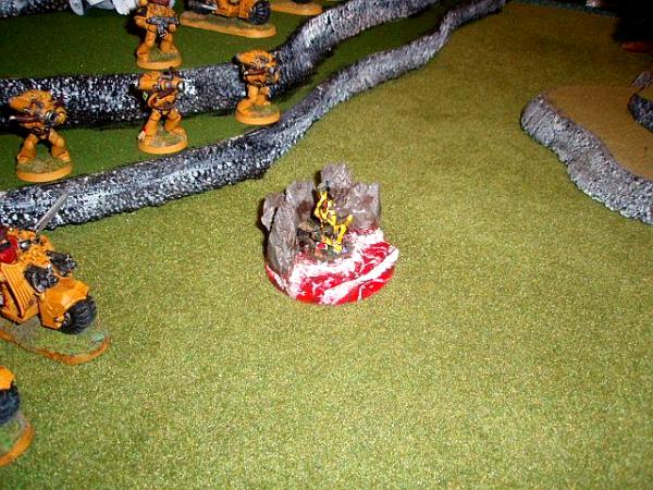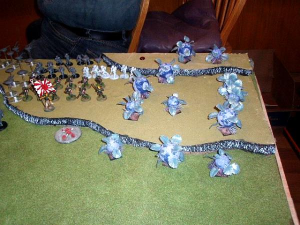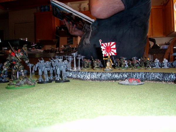 Hey, my friends wanted me to get some pics up. We had a battle, Tau vs My Space Leopards. Sadly it was over on turn two as my friend is a great tactician, and a bad roller...he stopped my vanguard vets and left only my libby, and wiped all but my general out of his biker command squad...but that left a dozen other bikes crashing home (with double HoW hits) another 10 assault guys, and my dread Obadai was eating his stealth suits, who came one HP from wiping him from ambush. He called it as my charge hit home. Anyway, pics just to show the one of the tables we play on with its home built terrain etc. Note his really cool army standard guy! (Yes, he went IJA (Imp Japanese Army colors) and his General's crisis suit. My friend does some good work!