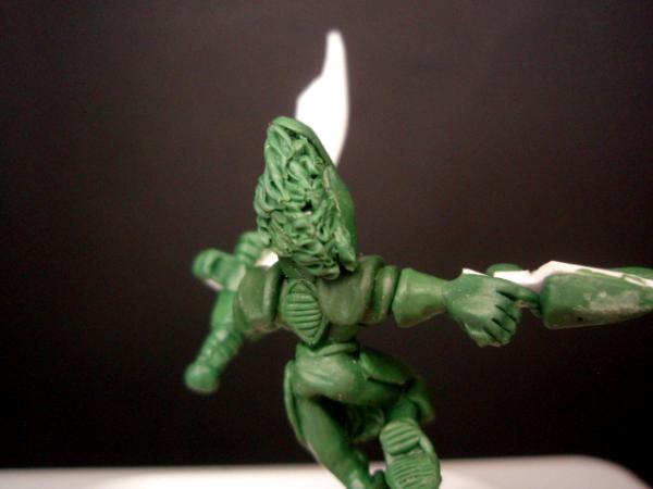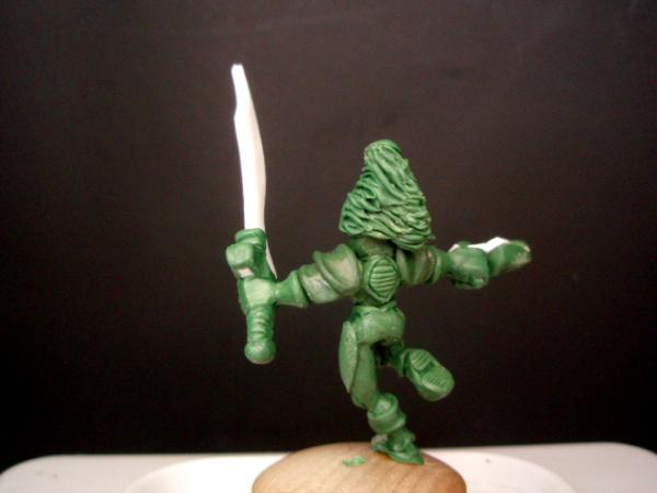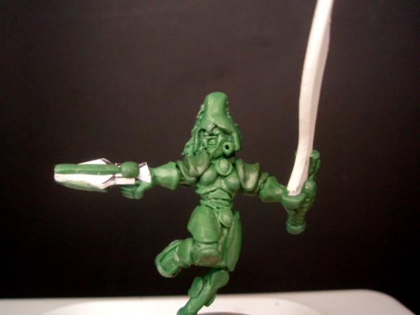 She is almost finished! Yes, she isn't idnetical to a howling Banshee (IP and all) but she is pretty close. I continue to learn. The sword is too large (I meant it large but the scale is still too much) and the shuriken pistol lacks detail I find the hard edge surfaces the hardest to do. She still has a bit of touch up on the pistol hand, and her helmet. But you can see where I went with this. Her sister is almost done as well, but that will have to wait until next week. A not on the pose. My idea is she is charging forward, when suddenly an enemy appears to her side, so she is reacting to him and leaning away from the point where contact may be made. Here's a few pics: