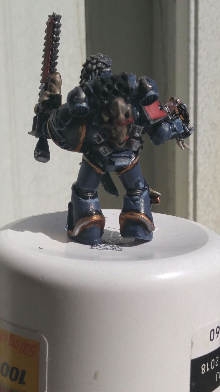 You went overkill on the highlights. For example the top of the shins. They are indeed too light. Try giving them a thin brush over with the base color to bring them down a bit? Other than that, it's pretty good. Very clean painting. Keep up the good work. With practice comes perfection.