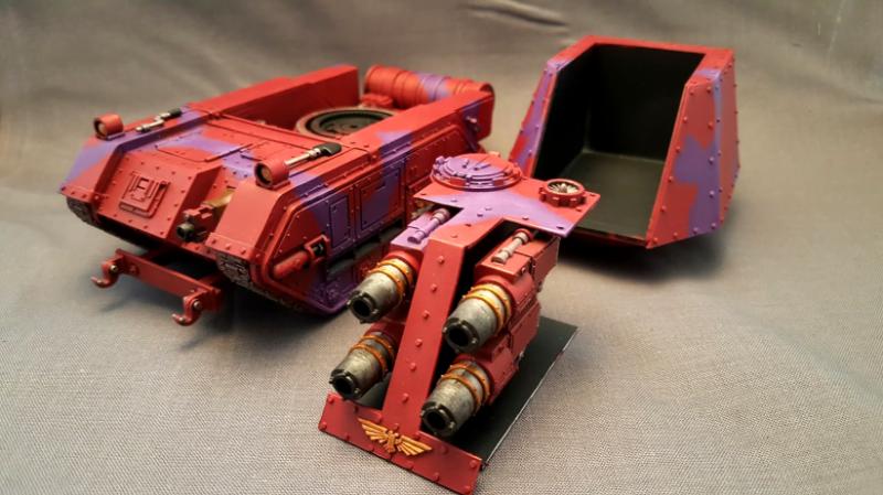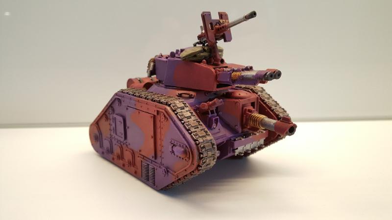 During the campaign to retake the hive city Vertis on Pyra it was found that the traitor guard had fortified every block in the city to drag out the fight for as long as possible. One year later and frustrated by their lack of progress in the fight the Pyran high command looked around to find something to help them, eventually they found the Terphion Wyvern and ordered a few for combat tests. While the the weaponary was formidable in the joob to clear out the enemy it was deemed to vulnerable due to having little to no crew protection, so a program was started to make a quik refit of over 1000 Wyverns which eventually became the Pyran pattern Wyvern mk1, while it did its purpose of protecting the crew it was deemed to big and was denied so the mk2 was made which had a sloped plastic steel to reduce the profil. As the profile could not become any smaller without redesigning the entire tank it was seen as enough and was accepted into service.